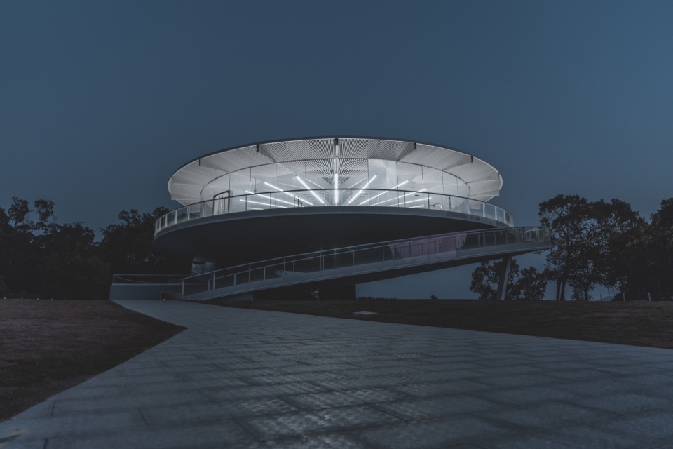 Within this ecological environment, our aim was to minimize the impact of the building’s introduction on the natural surroundings. Consequently, we opted for an “umbrella-like” circular steel structural system: the ground floor is largely elevated on stilts, while the roof and floor slab are supported and connected by upper and lower trussed Vierendeel frame systems, all transferring loads via a central column. This arrangement allows the activity area on the second floor to be free of peripheral columns, achieving fully open sightlines and 360° panoramic views. The non-accessible roof is supported by a central column within a 16-meter radius umbrella structure. The main activity platform on the second level, which serves as the primary circulation space, forms a circular plane with a 19-meter radius. It is supported by a three-point system consisting of the central column, the circular elevator core (for the cantilevered section), and a curved staircase (the mid-span of which is reinforced by an inclined column).