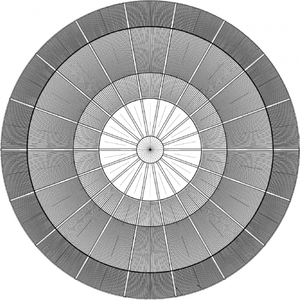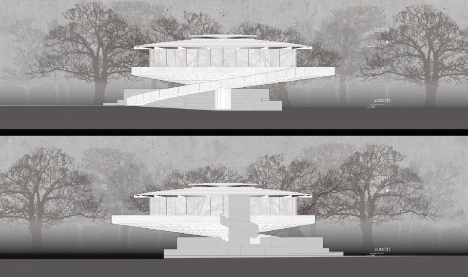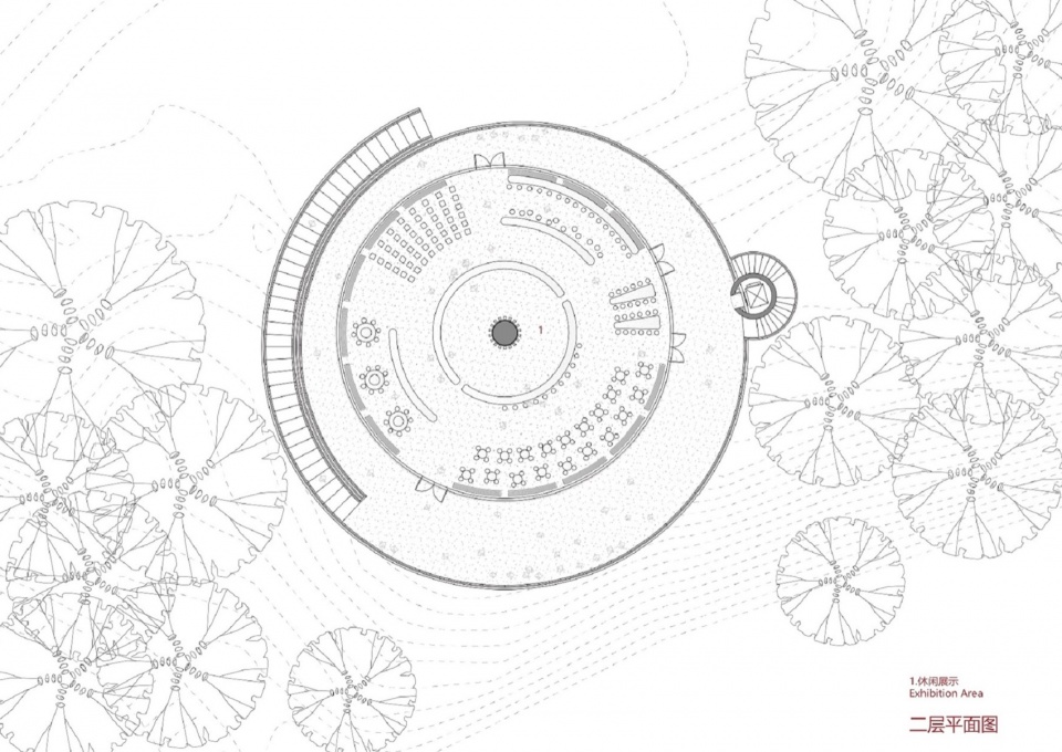 在这片生态环境中,我们希望建筑的植入尽量少对自然的环境的影响,于是我们选择了一个“伞状“的圆形钢结构结构类型:首层尽可能架空,屋顶和楼板由上、下由两个桁空腹架体系通过中间一根柱子支撑串联,让二层活动区周边不出现柱子,周边视线充分打开,360°全景视野。其中不上人屋顶,由16米半径伞状结构中柱支撑,二层的活动平台为主要人流活动空间,由半径19米的圆形平面构成,由中间中柱、悬挑段由圆形电梯筒,弧形楼梯三点支撑(其中弧形楼梯中段由斜柱支撑)。