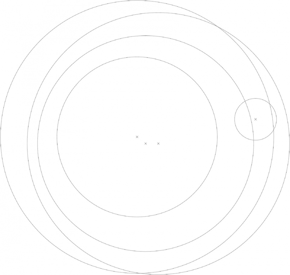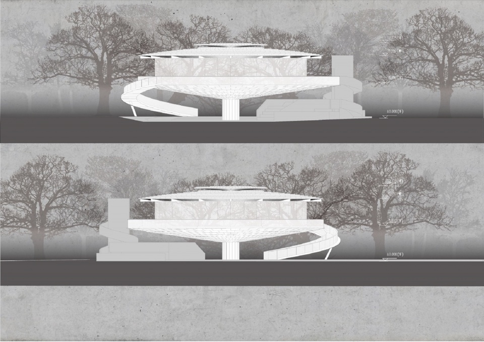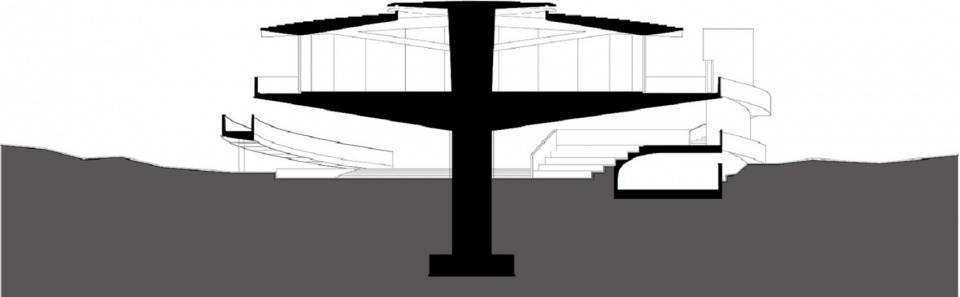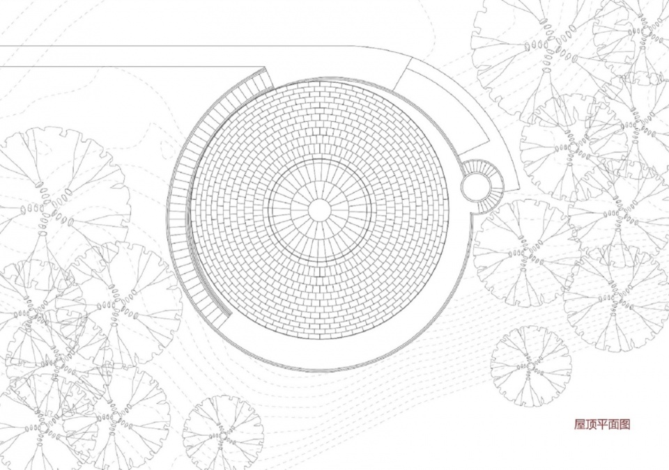为了表现全景的视野,我们选择了圆形的平面:地面的圆形聚场,二层的圆形平台以及圆形的屋盖。三个半径不同的圆(分别是16米,13米,19米)定位在不同的圆心,围绕结构柱,相互错位, 形成不同的覆盖,空间呈现不稳定的动态感,其中对着海的一面户外平台最大,成为公众看海的观景台。单跑弧形楼梯通过旋转,视线从山转到树,最后转到海平面。卫生间、电梯、设备等服务空间放置北侧,结合地形半下沉,露出来的半截体量形成台阶与地面连接,围绕柱子,在首层形成有顶的半户外剧场。