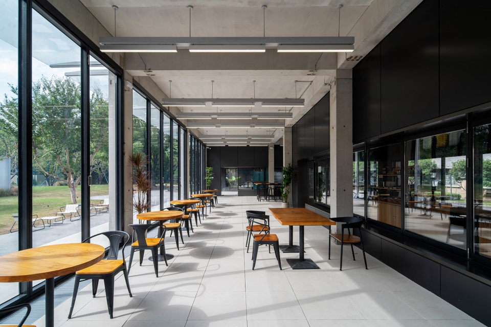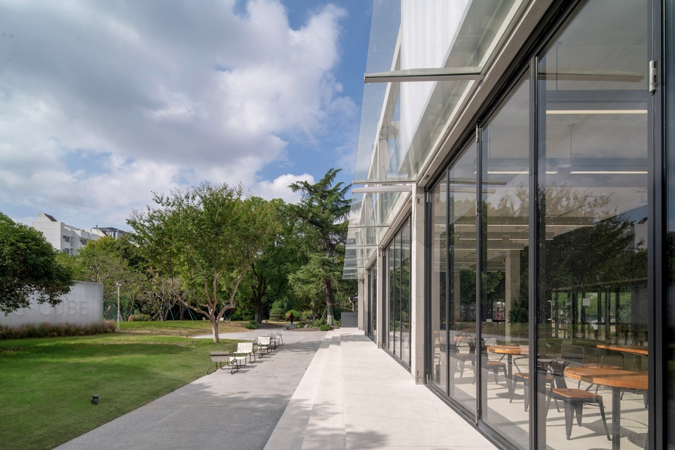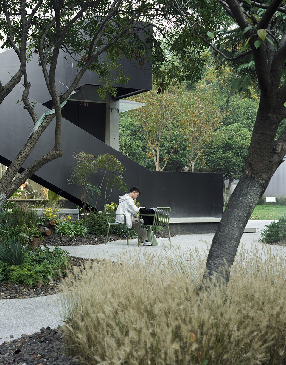 Landscape design is guided by environmental coordination: gray exposed aggregate permeable concrete is laid throughout the site, dotted with natural-toned volcanic rock gravel; the building edges are “flexibly connected” with ornamental grasses and ferns, preserving camphor trees, cedar trees, and more than ten osmanthus trees to continue the site’s green base.