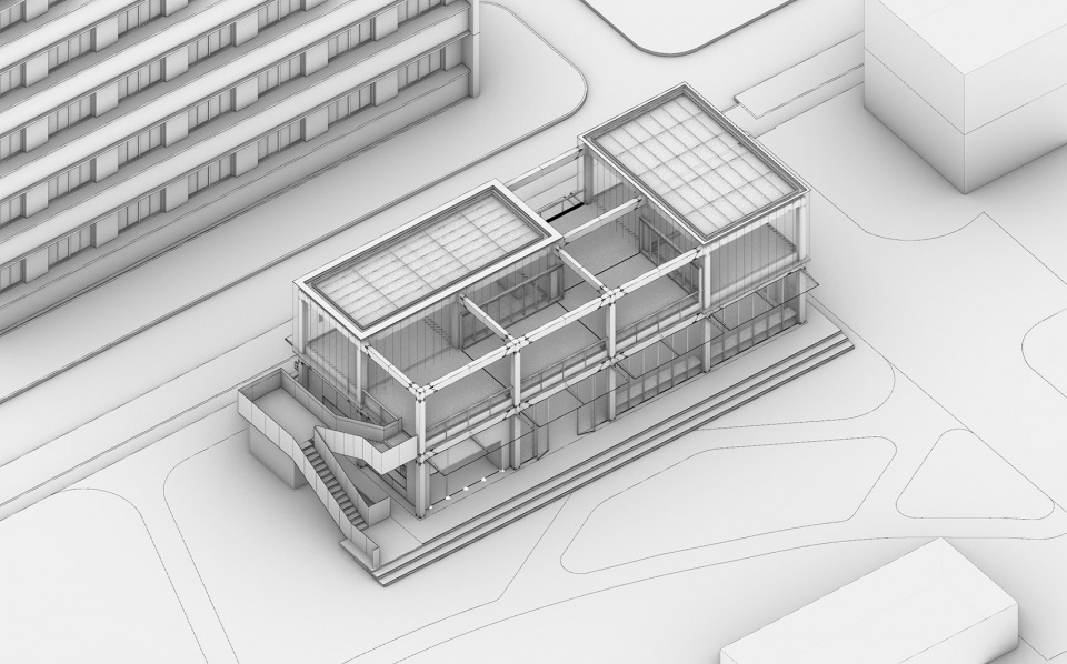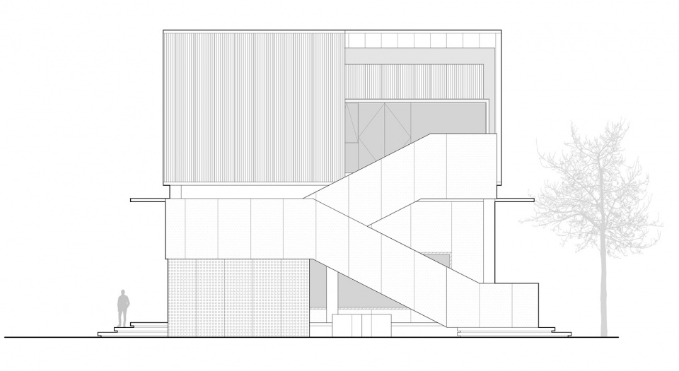 透明性是建筑核心的物理与空间特征。物理透明性通过材料选择与构造设计实现,有效消解室内外空间界限;现象透明性则体现于空间组织与感知逻辑中——以两个矩形体块的旋转叠合为基本形态策略,使内部功能布局与空间组织在立面上形成清晰视觉关联。