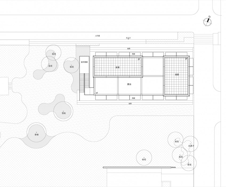 景观设计以环境协调为旨归:整体铺设的灰色露骨料透水混凝土,点缀自然色调火山岩碎石;建筑边缘以观赏草与蕨类植物进行“柔性衔接”,保留香樟、雪松及十余株桂花延续场地绿意基底。