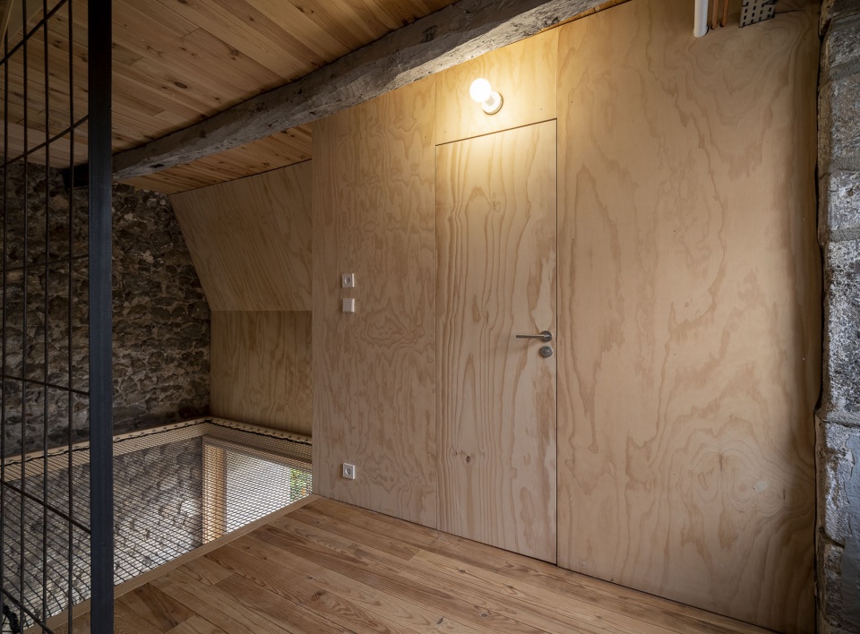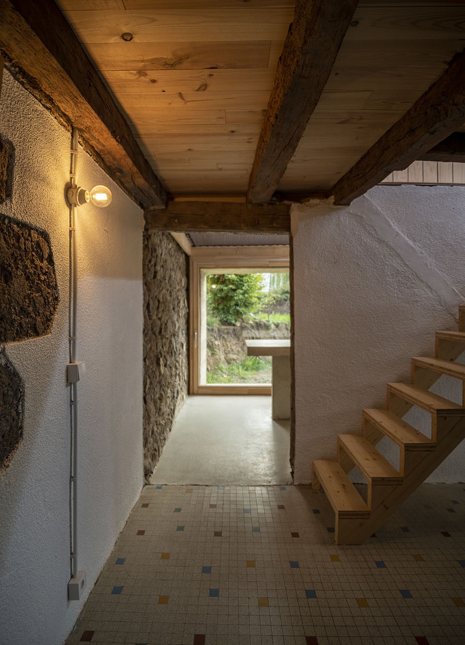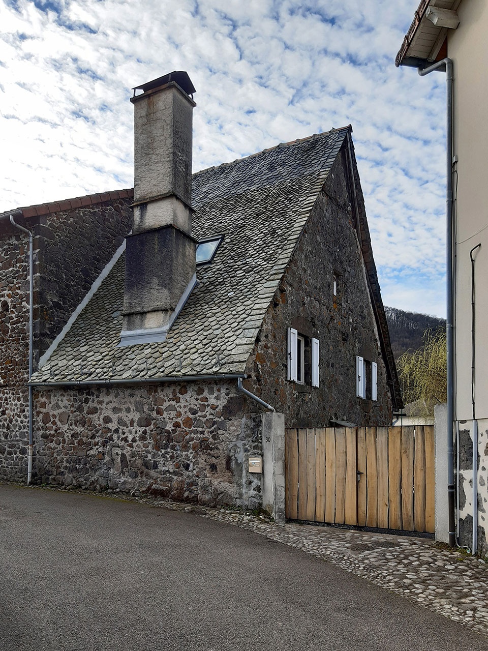 Refurbishment of a traditional house of Cantal, a rural area in the centre of France, characterized by a large sloping roof covered with local schist tiles and thick stone walls.