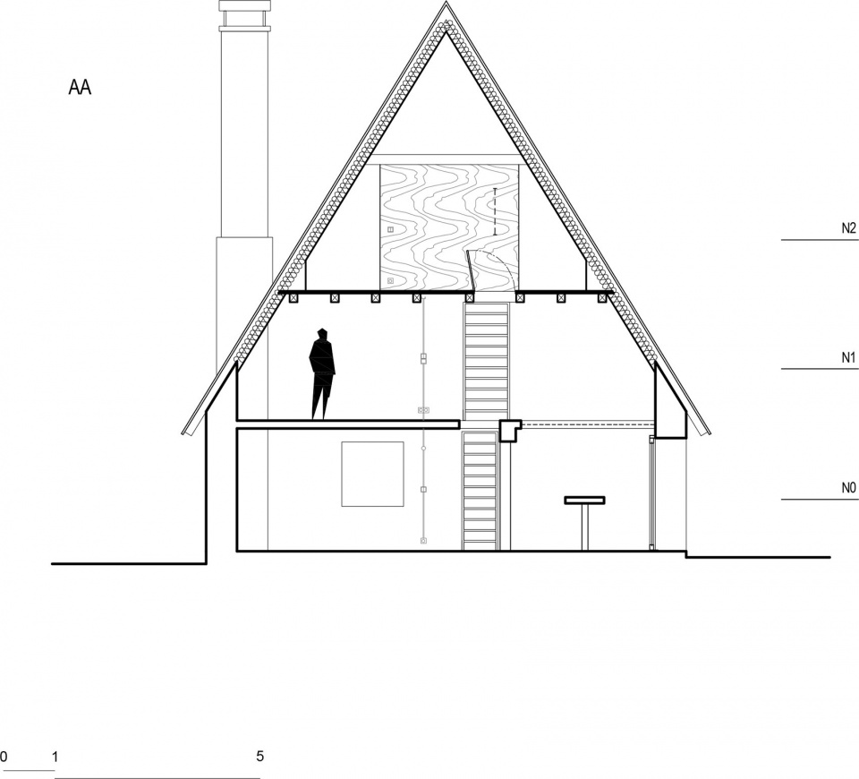 该项目为法国中部的康塔尔地区一座传统民居的翻新。当地民居的特征是覆盖着当地片岩瓦片的大坡屋顶以及厚重的石墙。