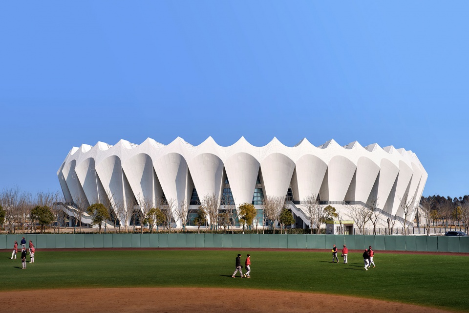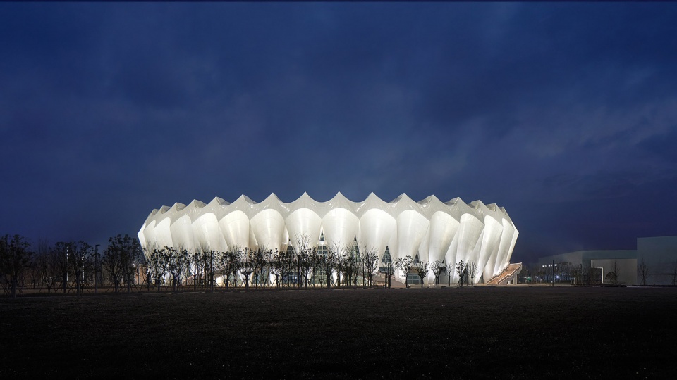 建筑立面以“芦苇”为原型。大尺度三角刚架与屋盖协同工作,既抵抗拉索张力,也承担风荷载使结构更稳定,在崇明大风环境中保持平衡。内外锥形双曲扇形构成连续的起伏,如风吹芦苇般轻盈。铝板与玻璃交替形成虚实层次,材料在光线中转折,生成近似花冠的外观,使体育建筑在力量之外呈现自然的一抹柔性。
