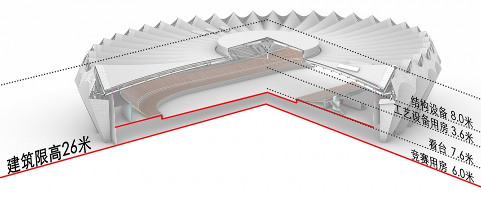 项目地处崇明生态岛,所在位置限高严格,而国内多数自行车馆通常为30-45m。面对极限高度,团队对功能、结构与设备层进行了全面压缩与重组,最终在极限内完成所有专业需求。设计通过下沉内场训练空间(下沉1.2m)、压缩设备层高、优化座席升降等方式,最终将所有需求嵌入26m建筑体量中。空间紧凑但不显压迫,形成极高的空间效率。
