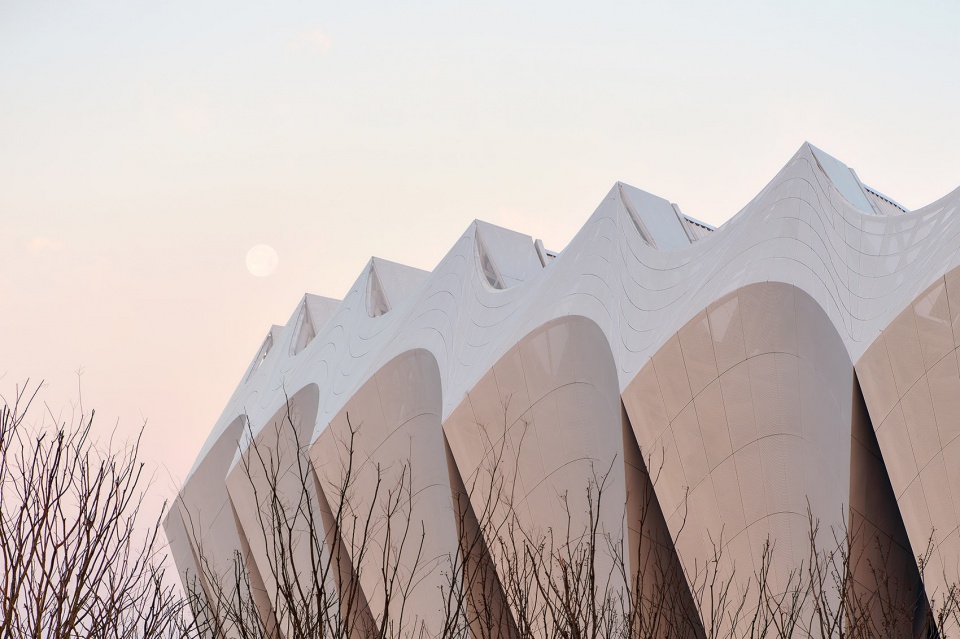 The building’s facade takes reeds as its formal inspiration. Large triangular rigid frames work in tandem with the roof, counteracting the tension of the cables while resisting wind loads, ensuring stability in the strong-wind conditions of Chongming. The inner and outer conical, hyperbolic fan-shaped surfaces create a continuous undulating form, as light and airy as reeds swaying in the breeze. Alternating aluminum panels and glass introduce layers of solidity and transparency, their surfaces folding and shifting in the light to produce a crown-like appearance. In this way, the velodrome balances structural strength with a gentle, natural softness.