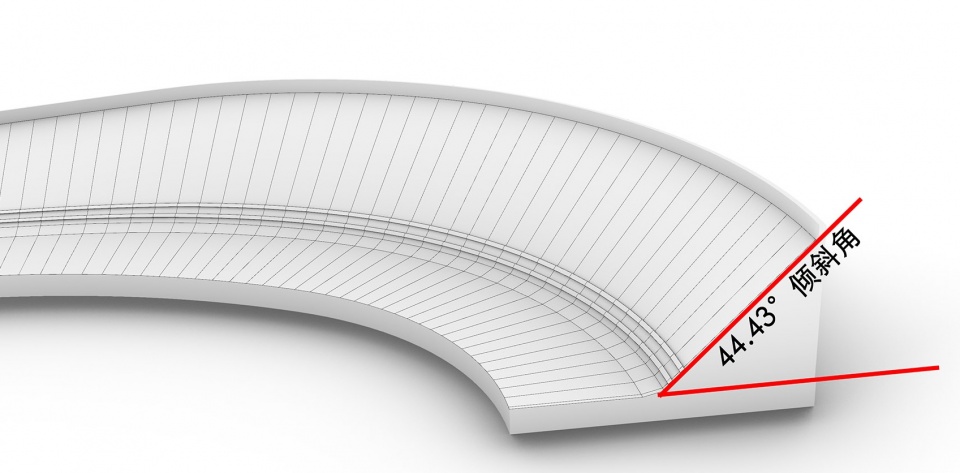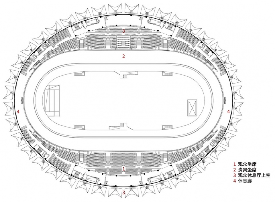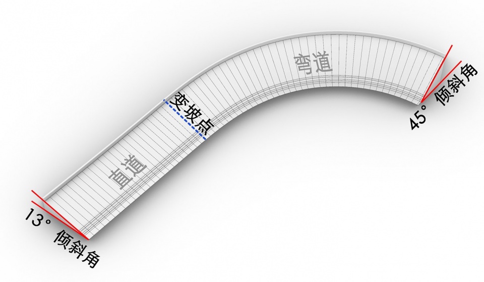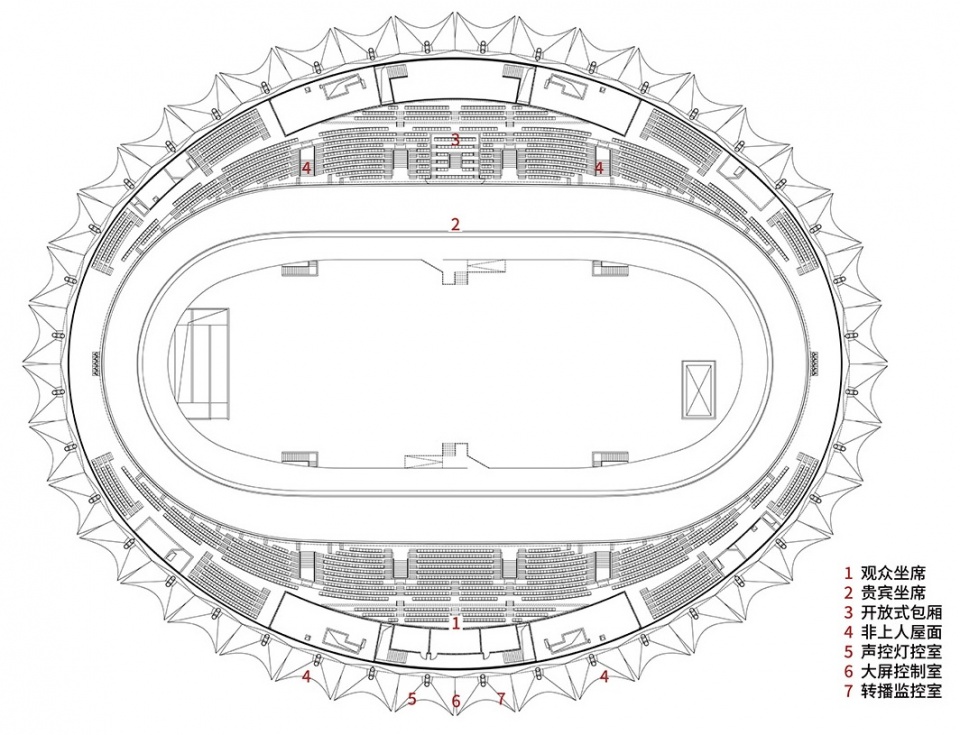 自行车馆最独特的观看体验来自“非环形布座”特性:弯道处倾角过大,座席无法连续布置,直道两端视线条件逐渐变化,传统方案中,出入弯区向来是视线难题。