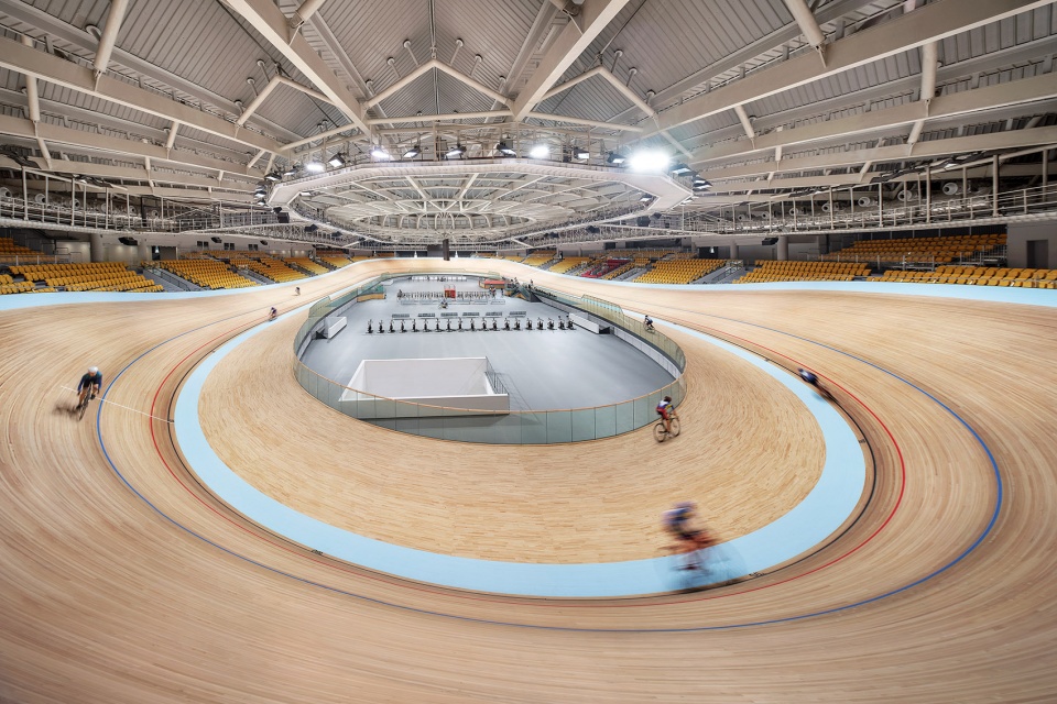 场地自行车比赛的核心构件是木质复合曲面赛道,上海自行车馆赛道由直道、弯道、过渡段和蓝区组成,由11000余根西伯利亚欧洲赤松手工铺设而成。上海自行车馆的赛道遵循UCI国际认证标准,赛道圈长250m,其弯道倾角在最陡处接近45°,使空间成为速度力量的直接载体。赛道并非椭圆式对称,弯道外侧更宽、更陡,形成两个“高点”,赋予了比赛强烈的冲刺戏剧性。赛道内部的准备区面积达2720m²。除专业用作热身、检录、媒体操作空间外,场馆将其日常功能进一步扩展,使其可转换为篮球、羽毛球、乒乓球等训练场地,提升场馆可运营性与城市服务属性。