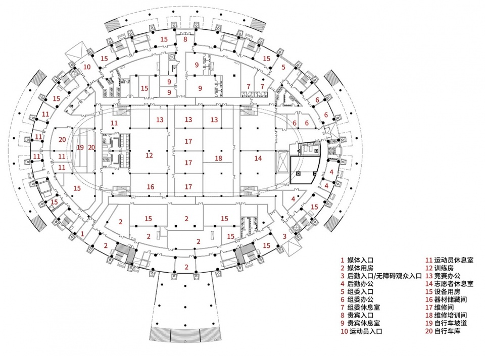 不同于跑道类开放场地,自行车馆的赛道是高度封闭的“立体碗形”,运动员无法直接从场地侧面进出。鉴于崇明地下水位高、木质赛道对温湿环境敏感,建筑采用场地整体抬升策略,将下方层作为训练与功能用房,并设立独立的运动员专用通道,与观众流线分离,避免交叉。