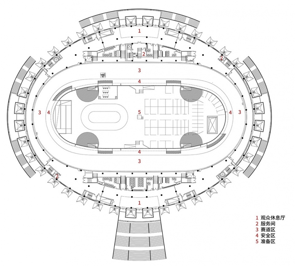 首层训练空间紧密衔接休息室、专用通道和内场,构成连续的专业动线体系。在大赛期间,这些房间也可转换为车队休息与器材配置空间,为赛事运行提供高效支撑。