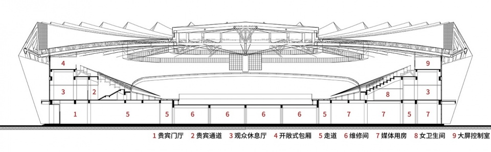 The project is located on Chongming Eco-Island, where stringent height restrictions apply, while most velodromes in China typically reach 30-45 meters. Confronted with this limit, the design team undertook a comprehensive compression and reorganization of functional zones, structural depths, and service layers, ultimately meeting all technical requirements within the extreme height envelope. Through strategies such as lowering the infield training area by 1.2 meters, compressing the height of the service and equipment zones, and optimizing the elevation profile of spectator seating, the design successfully accommodated all programmatic and technical requirements within a 26-meter building height. The resulting spaces are compact yet never oppressive, achieving exceptional spatial efficiency.
