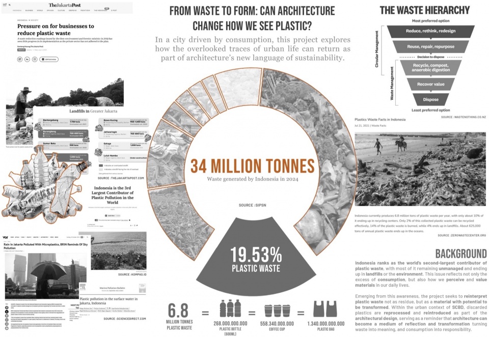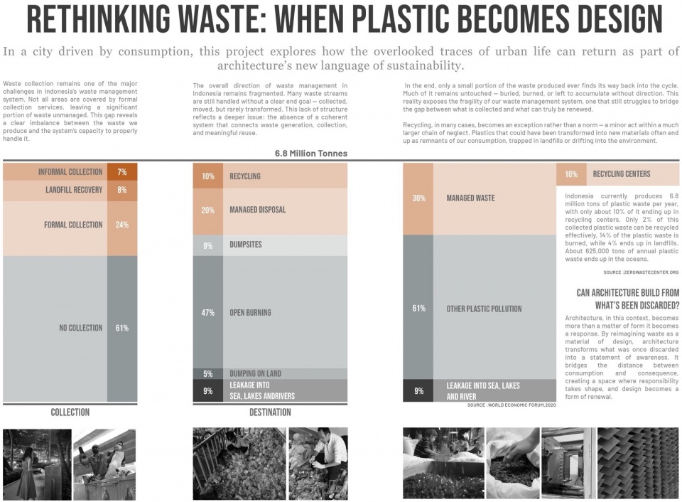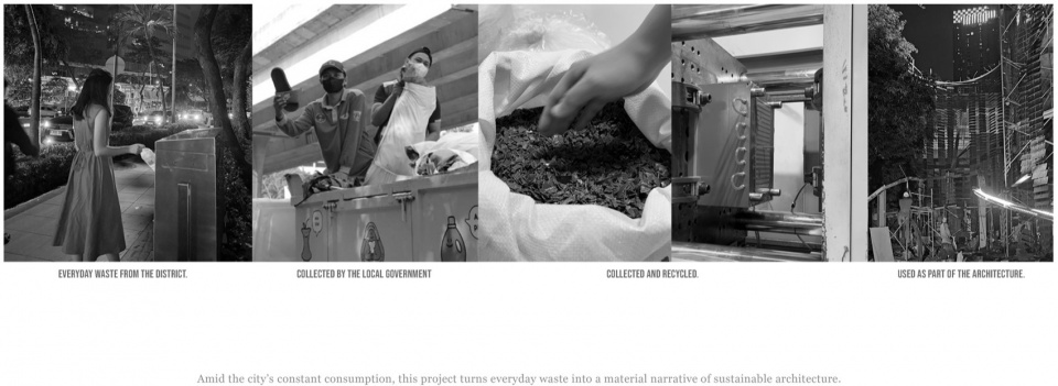 Sourced from 4,800 kg of SCBD’s (Business Districts Area) weekly plastic output, this project generates 16,800 units of functional architectural Lattice Plates. By integrating this recycled material system into a prominent site of Jakarta, the structure stands as a testament to waste management issues, reminding the public and policymakers of the 7 million tons of plastic untreated annually in Indonesia.