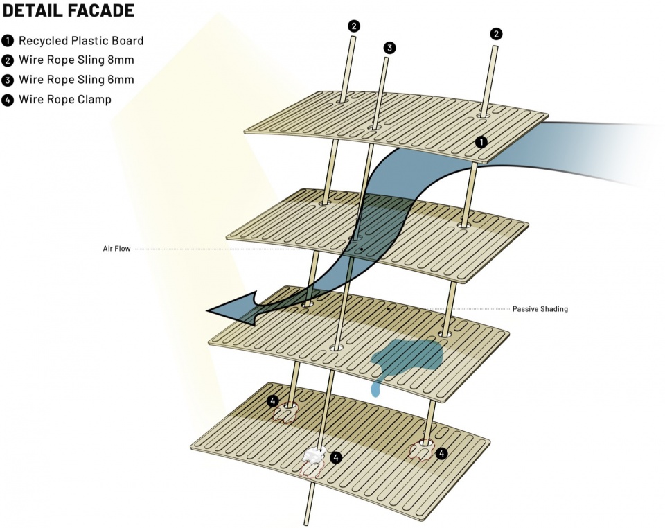 该项目利用了SCBD(苏迪曼中央商务区)每周产生的4,800公斤塑料废弃物,生成了16,800个功能性建筑格栅单元。通过将这种再生材料系统整合到雅加达的核心地段,该结构成为了废弃物管理议题的有力见证,提醒公众和决策者关注印度尼西亚每年700万吨未经处理的塑料垃圾。
