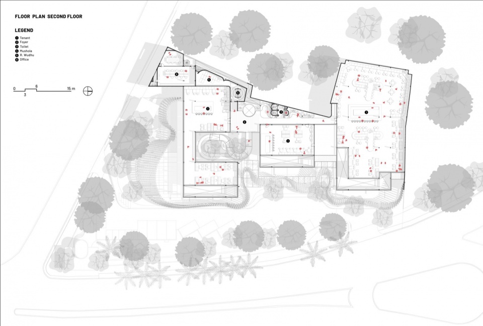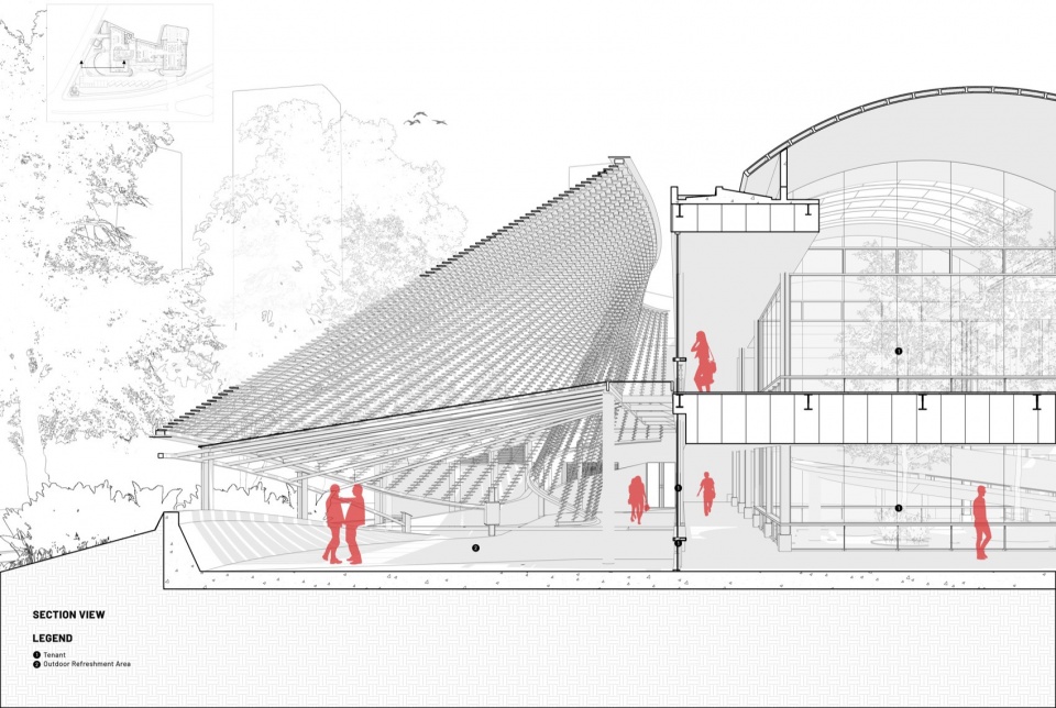 In a move to coexist with the site’s ecology, the design maintains a minimal 40% ground cover, choreographing saleable areas and activity spaces to interweave with the existing 20-meter tall trees. Rather than treating landscape as a supplement to architecture, the process was reverse-engineered: the massing was generated around the preserved tree zones. This creates a fluid dialogue between the parametric envelope and nature, connected by porous terraces that allow the trees to thrive while optimizing the functional area. The resulting massing maximizes leasable efficiency through a series of transitional outdoor terraces that bridge the parametric facade with the trees, accommodating arboreal growth while retaining commercial value.”