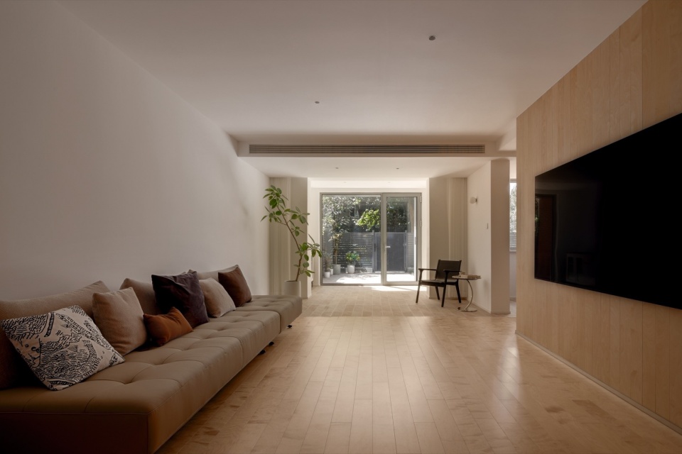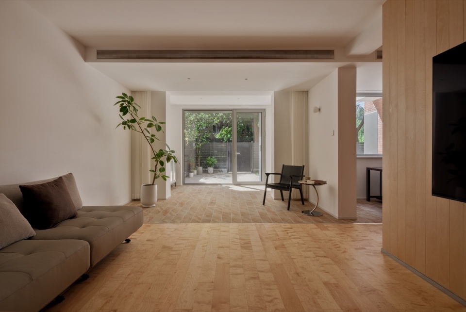 虽然客厅是一个连续的整体空间,但其中既有开阔的区域,也有类似狭窄小径般的尺度空间,为人和猫提供了多样、富有层次的居所体验。此外,原本客厅与庭院之间设有封闭的阳台,使室内与室外之间的距离变得疏离,空间也相对昏暗。我们首先将阳台取消,使自然光尽可能深入室内,让客厅变得明亮起来。同时,通过将室外铺装材料延伸至室内较深的位置,让庭院从户外自然地延续进室内,形成一种“室内也能拥有一小片庭院”的空间结构。