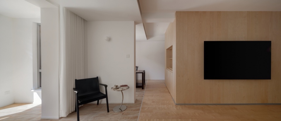 In reorganizing the layout, the original three private rooms were reduced to two, and the area of one room was incorporated into the living space. Removing several interior walls increased the amount of sunlight entering from the south-facing windows, resulting in a brighter and more fluid, circulation-friendly living room.