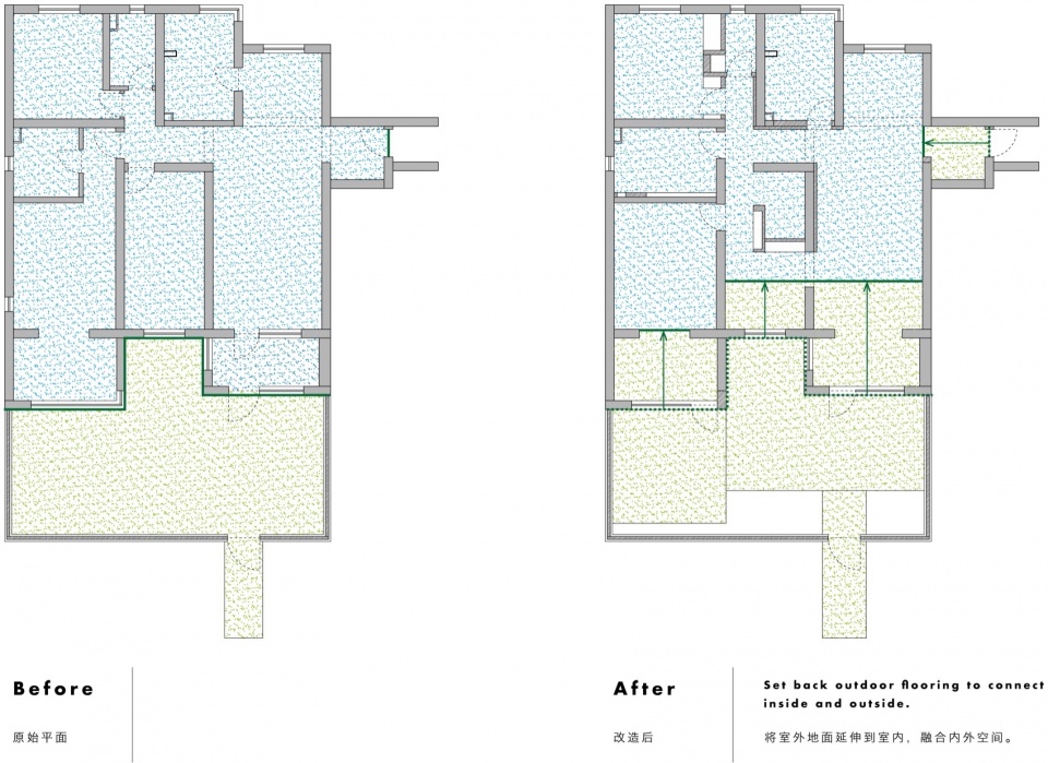 一般来说,室内与外部的边界通常由建筑外墙来界定,而我们通过将铺装的边界线“向室内错动”,为室内创造了一个如同室外般的空间体验。