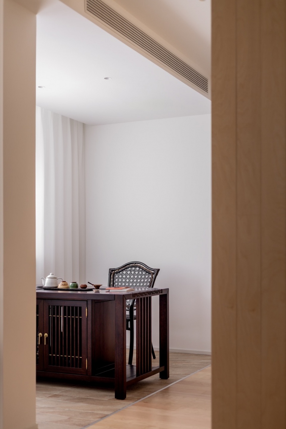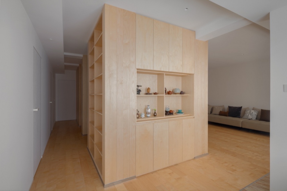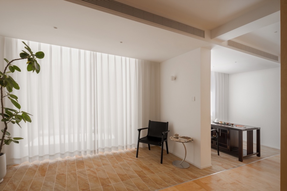 制造“边界错动”效果的铺装石材延伸进入小玄关、客厅、品茶空间以及卧室的一部分,在功能与心理层面上都带来了空间的扩展。同时,在同一空间内让木地板与石材并置共存,也为生活方式和空间使用方式提供了更多可能性。