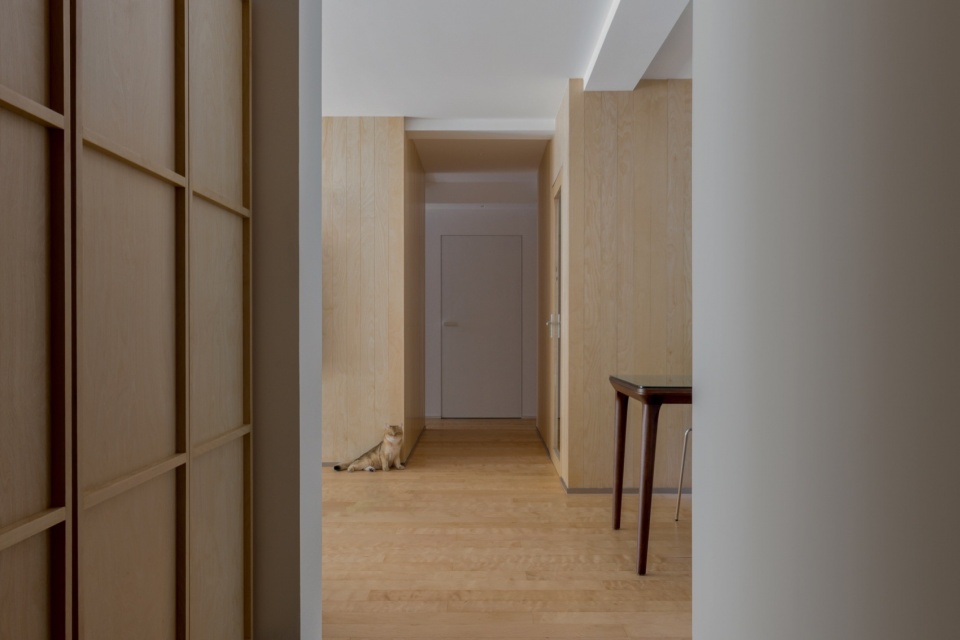 在平面上处于“未对齐”关系的客厅回游核心墙体与厨房墙体,采用了同样的桦木材料加以统一。而围绕它们的其他墙面则全部以白色处理。通过这种对比手法,营造出一种仿佛两座桦木“小屋”在空间中轻微“错位”而立的不整齐美感。