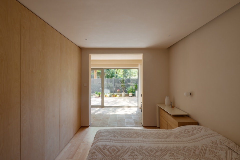 客厅与卧室使用的地面均统一为桦木木地板,但卧室的墙面与天花并未采用客厅所使用的白色涂料,而是选择了略带暖色的柔和涂装,使卧室呈现出更加舒缓、温柔、令人安心的氛围。
