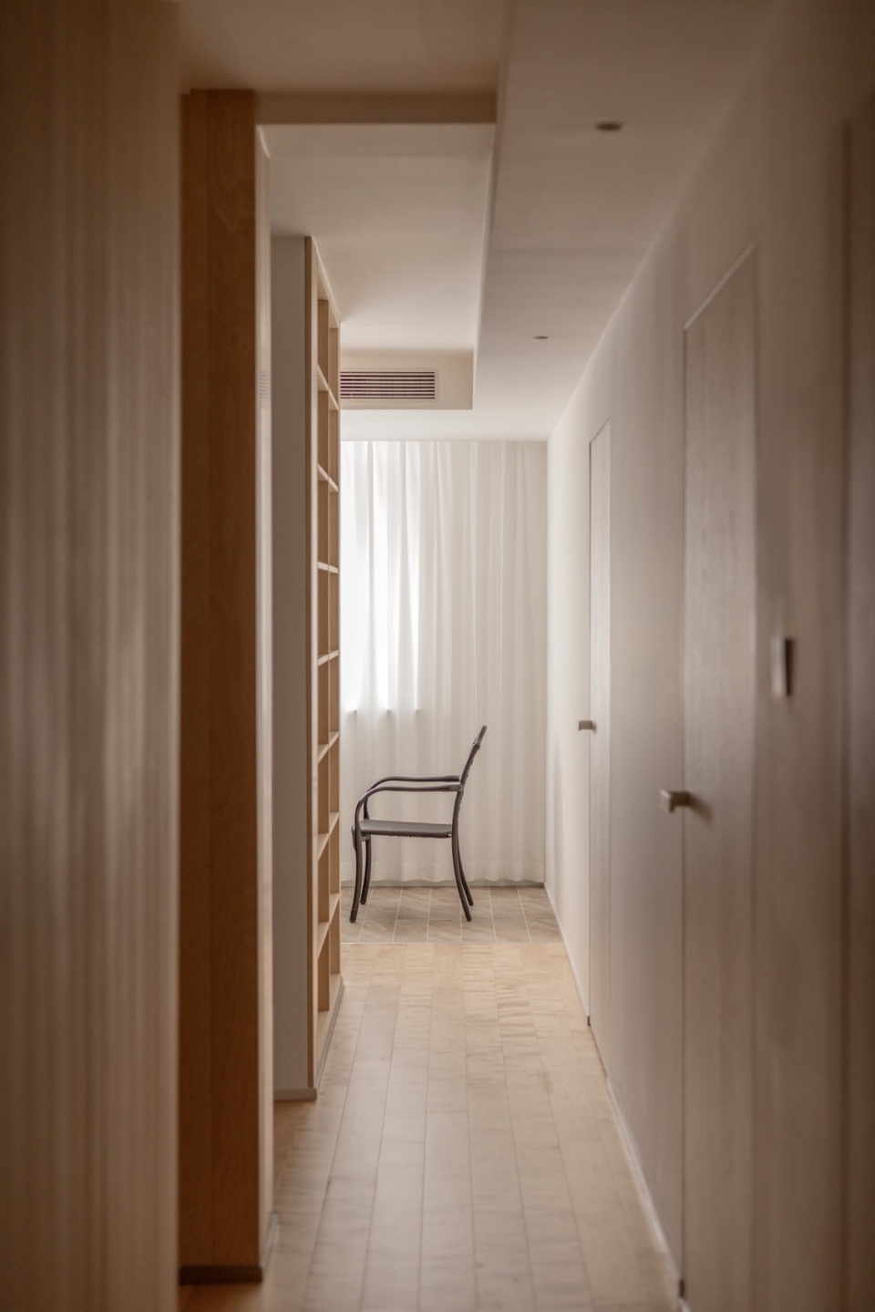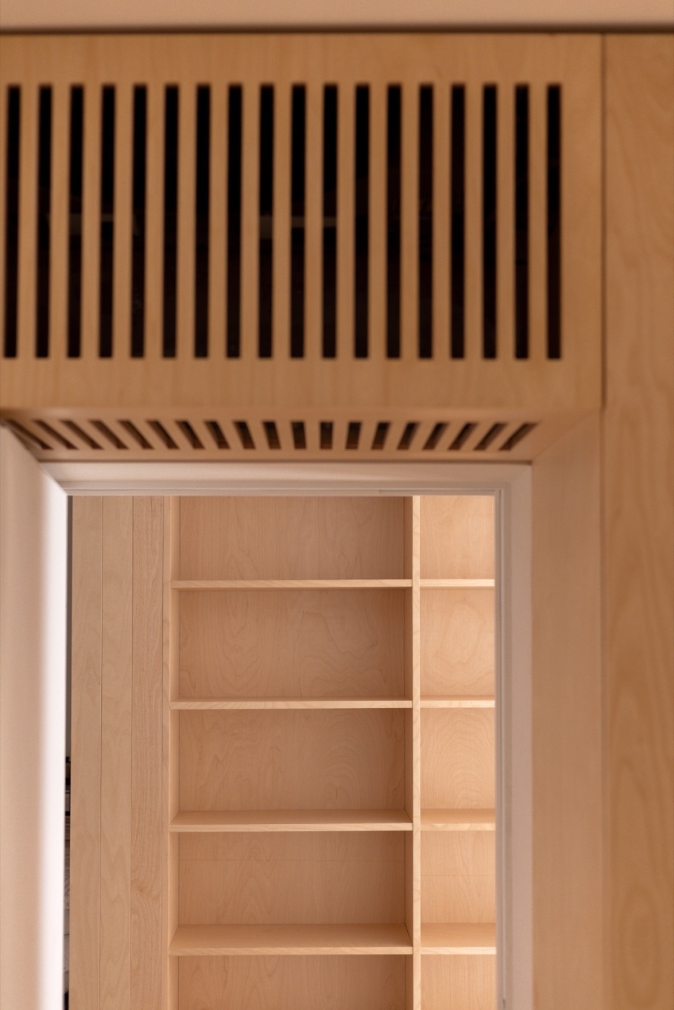 The wall that forms the center of the living room’s circulation and the kitchen wall—although not aligned on plan—were finished in the same birch material. The surrounding walls were kept entirely white. By creating this contrast, the two birch “volumes” appear to stand slightly misaligned within the space, producing a gentle sense of intentional irregularity.