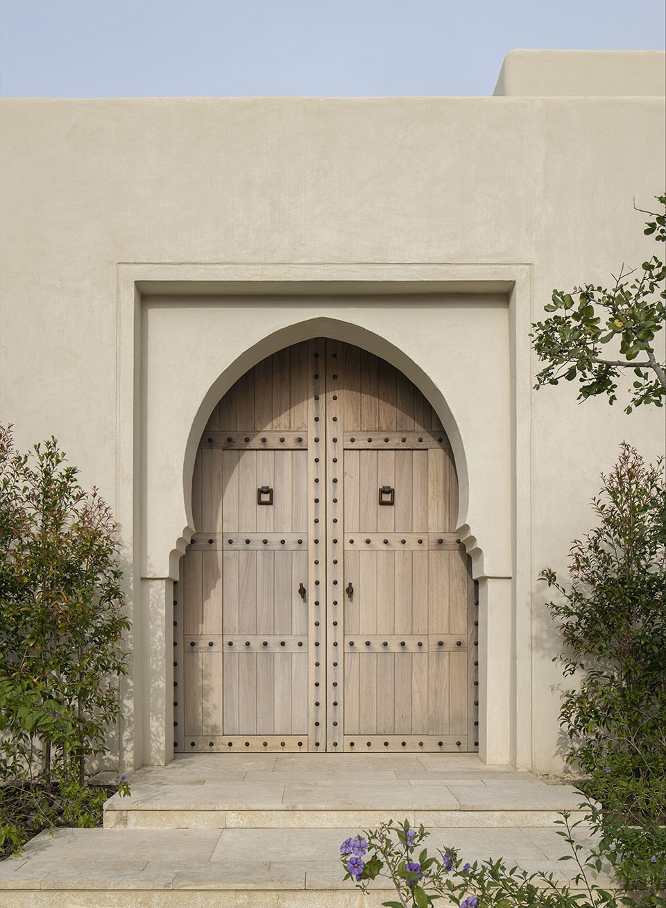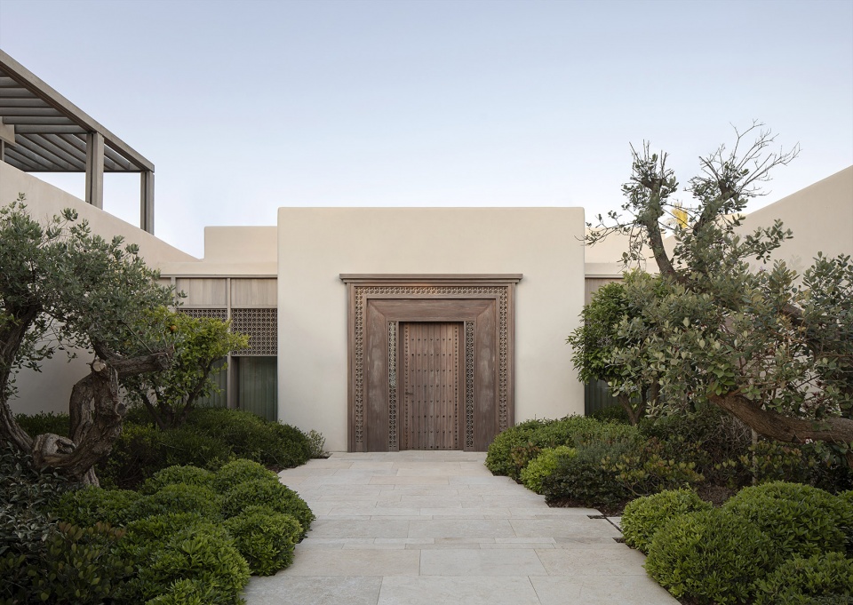 A collection of doors throughout the villas reads like a series of architectural portraits. Each is individually designed, echoing the singular character of its space. This artisanal ethos extends to the Moucharabieh, intricately crafted to balance function, ornament, and cultural symbolism. Meticulously designed piece by piece to filter natural light, they cast warm, shifting shadows across every surface, infusing the architecture with a vibrant, ever evolving rhythm.
