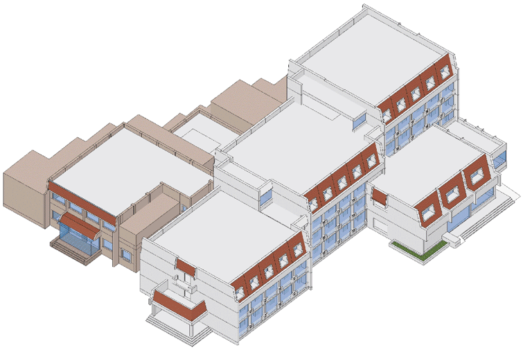 Balconies are replaced by bay windows with single large glass panes, giving the building a refreshed, elegant appearance. The recessed areas between the bay windows are covered with louvers. The window systems are integrated with ventilation panels to eliminate visible operable sashes. The sloped walls on the top levels are upgraded with folded perforated aluminum panels, avoiding extra weight and adding a refined modern touch. Overall, the renovation functions as a subtle yet effective cosmetic upgrade. Next to the campus hospital with high frequency of visitors, the dramatic renovation of the building is less noticed by the people passing by because of such a subtle façade renovation. The late-1980s design already features well-proportioned façades and harmonious height variations, the new design is to update the building with modern aesthetics.