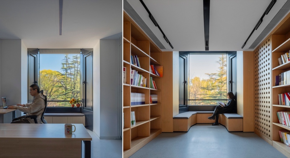 环绕中庭的是原建筑保留下来的短支剪力墙,形成一系列沿外窗的龛式小客厅。它们重复的韵律增强了空间的礼仪性。二层是向跑马廊敞开的图书资料馆和开放式办公区,进一步用重复的书架和隔墙加强吹拔空间的礼仪感。过度的礼仪性又被以户外野生绿地为主题的中央会客区地毯打破。耀眼的橘色沙发和浅色木装修都渗透着学院年轻的生命力。