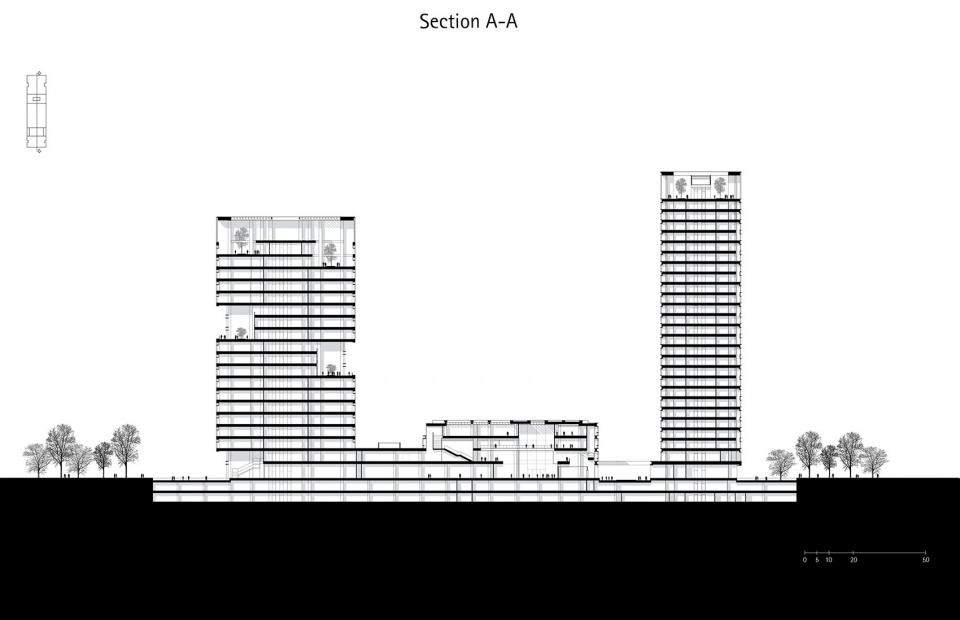 A continuous white aluminum façade band visually unifies the office tower, museum, and residential tower into a single ensemble. Large expanses of glass characterize all three buildings and emphasize the coherent architectural expression. At the same time, each façade is tailored to its respective function: the office tower’s glass surface gains depth through horizontal off-sets and vertical cut-outs that continue inside as two central sky lobbies; the museum’s transparent envelope underscores its public role; and the vertically articulated residential façade incorporates natural ventilation elements and technical systems. Terraces, generous lightwells, and a rooftop garden add further social and environmental value to the development.