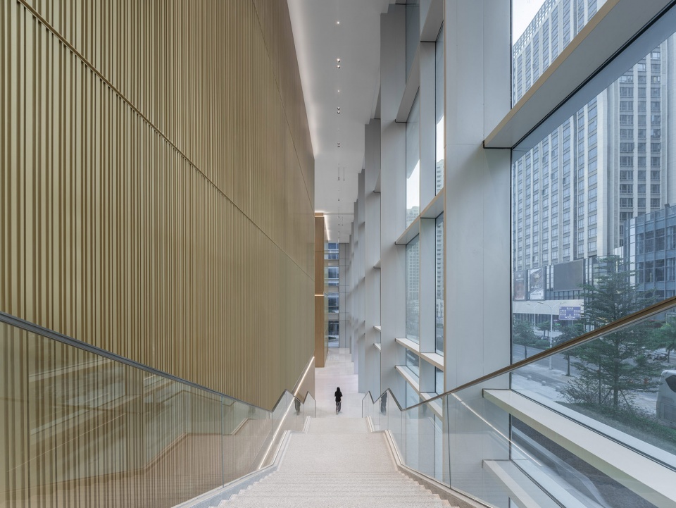 设计的核心理念是在总体规划的体量内进行三段式布局:北侧细长的办公塔楼承载潮宏基集团总部功能;紧凑的博物馆建筑是整个建筑群的核心并延续了城市文化轴线。博物馆内部采用“屋中屋”策略设置独立展箱,以便控制敏感展品的光照与温湿度。连桥与开放式阶梯串联各展览空间,形成连续的参观流线,同时在不同节点提供多角度观展体验。一层通道与公共门厅将博物馆引入城市以及片区的公共文化结构。