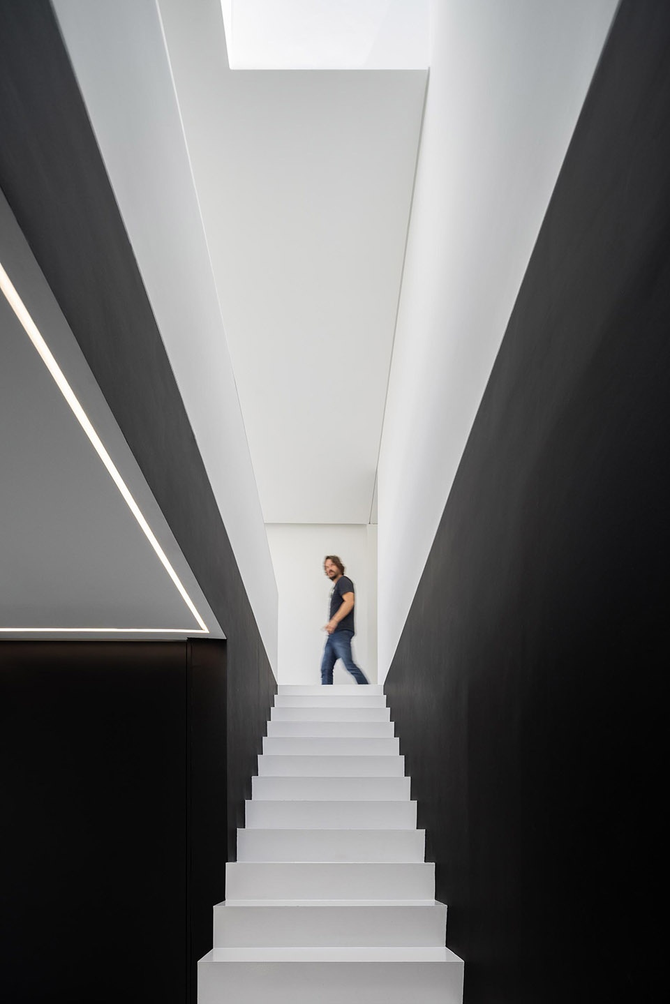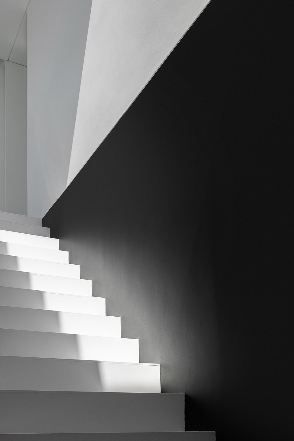 ▼大厅以一座白色钢板悬浮楼梯为亮点,a suspended staircase in white steel plate