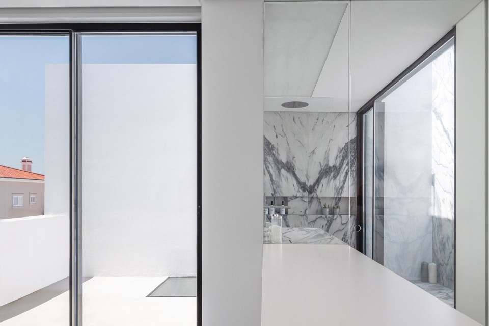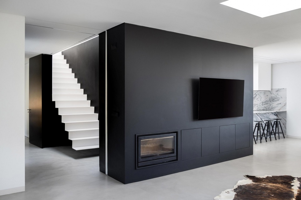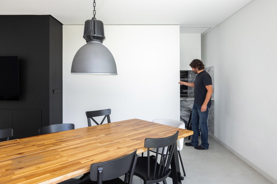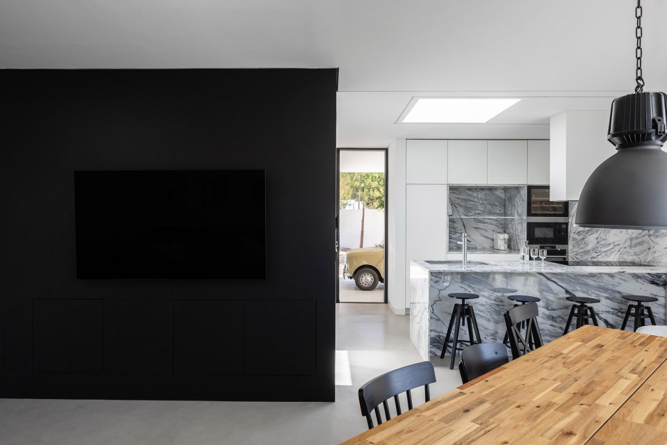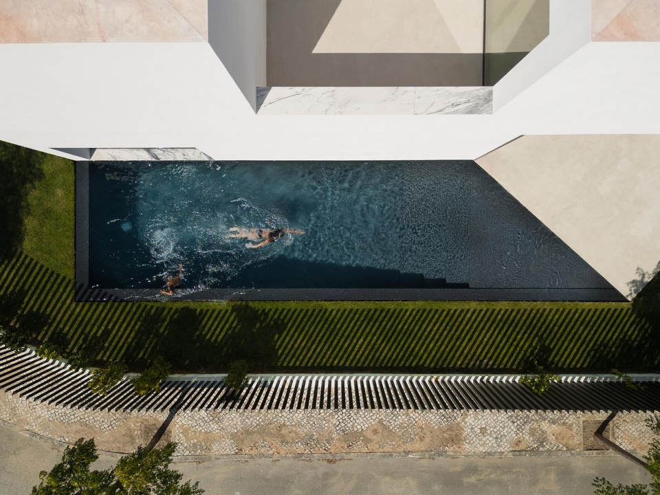 The exterior materiality privileges painted render, contrasted with black anodized aluminum frames and enamelled iron details. Inside, the palette remains coherent and refined: painted plaster walls and ceilings, white marble on feature elements, black enamelled panels, and continuous grey microcement flooring. This restrained selection emphasizes simplicity, elegance, and a strong contemporary character.