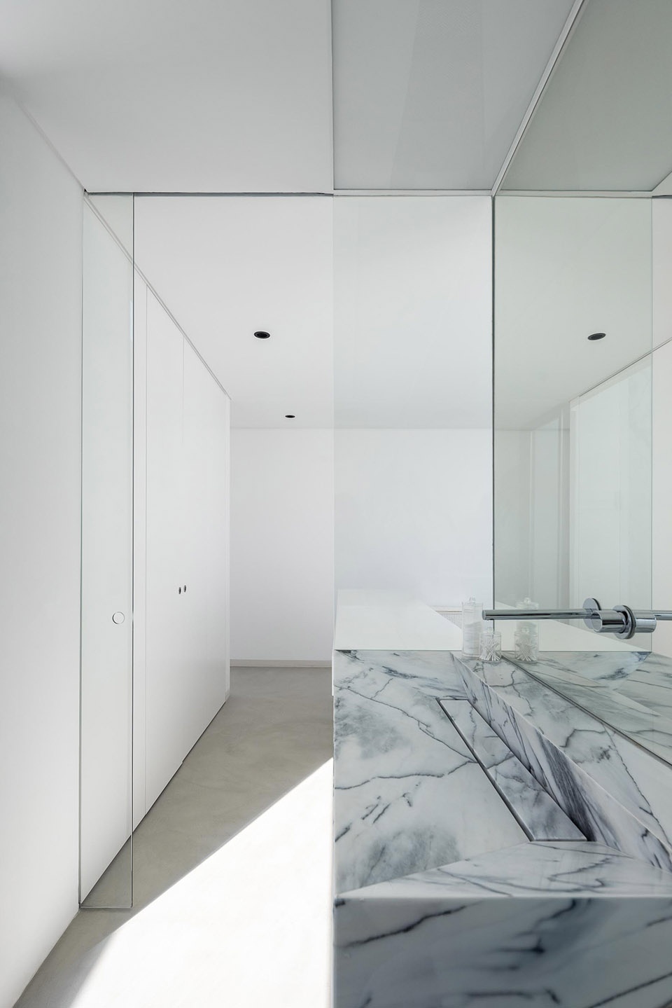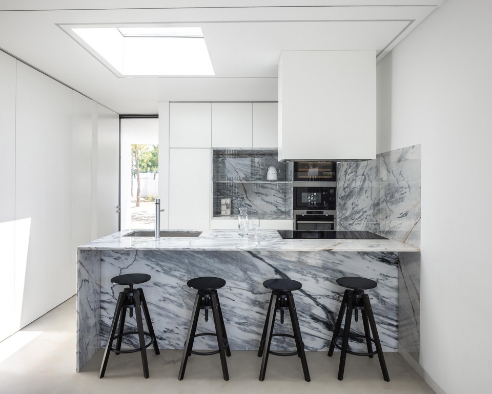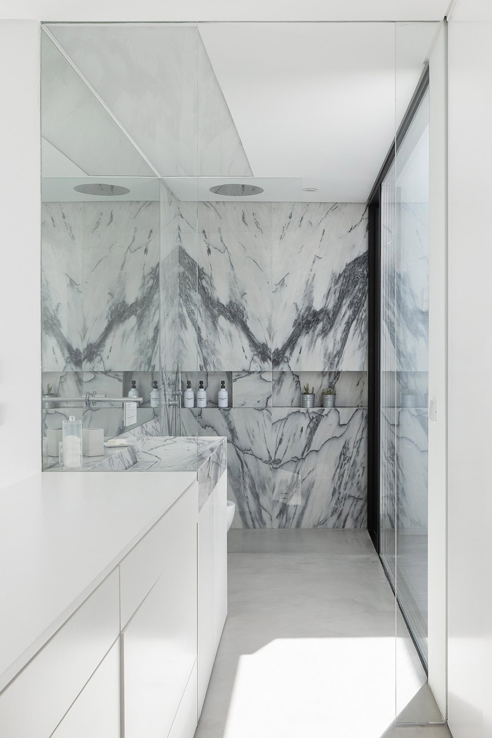 The exterior materiality privileges painted render, contrasted with black anodized aluminum frames and enamelled iron details. Inside, the palette remains coherent and refined: painted plaster walls and ceilings, white marble on feature elements, black enamelled panels, and continuous grey microcement flooring. This restrained selection emphasizes simplicity, elegance, and a strong contemporary character.