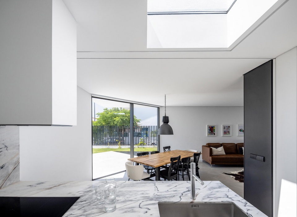 住宅共两层,明确区分公共与私密空间。一层为日常活动区域,包括入口大厅、客厅、厨房与一间工作室。入口大厅以一座白色钢板悬浮楼梯为亮点,其背后的深色背景营造出雕塑般的视觉焦点。另一条次要动线通过兼作停车区的带顶门廊进入厨房,大幅提升使用便利性。客厅与厨房通过大面积玻璃开口与户外连通,实现与泳池与花园的无缝联系,并通过布置在烹饪区与起居区上方的天窗引入更多自然光。