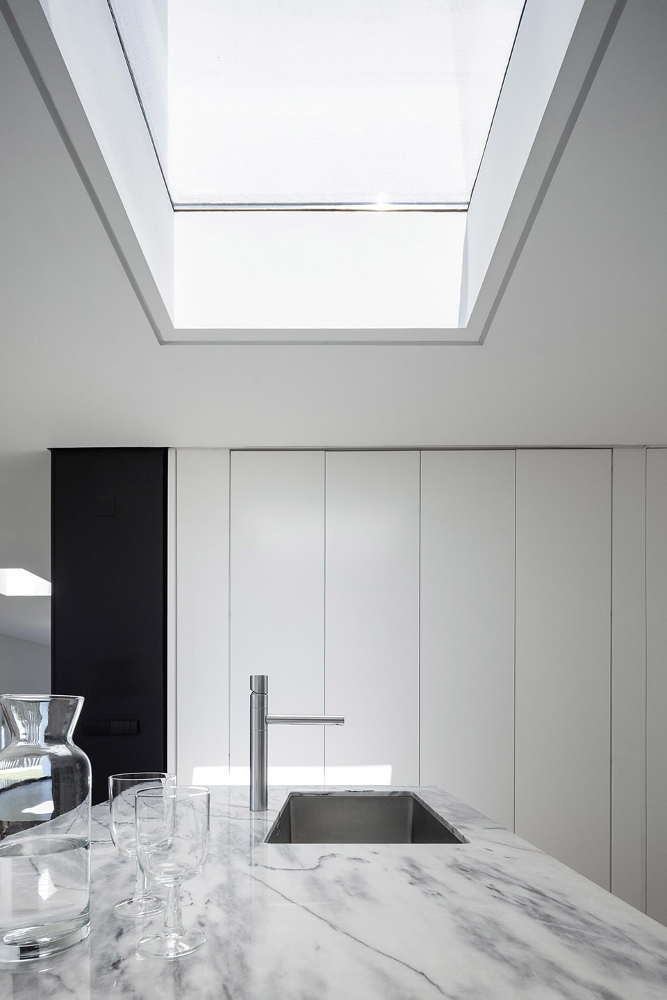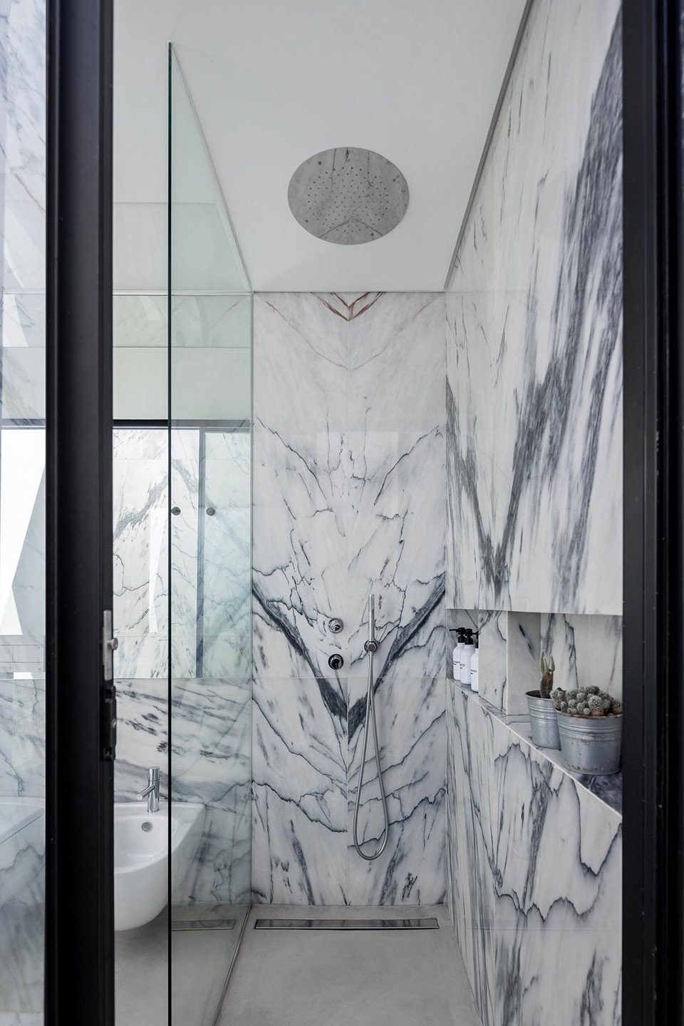 外部材料以喷涂饰面为主,搭配黑色阳极氧化铝窗框与搪瓷铁构件形成鲜明对比。室内材料保持一致且精炼:粉刷石膏墙壁与天花、局部使用白色大理石、黑色搪瓷面板,以及连续的浅灰色微水泥地面——共同构建出简约、优雅、富有当代感的氛围。