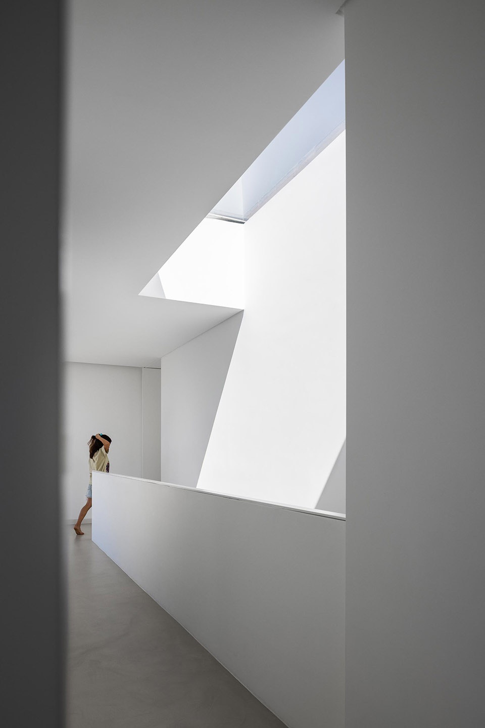 The upper floor is reserved for the private area. It includes two bedrooms served by a shared bathroom and a master suite with its own bathroom and a private open-air patio. Circulation is naturally lit by a generous skylight above the staircase, reinforcing a sense of brightness throughout. All bedrooms feature private balconies, with two of them of larger scale, incorporating skylights into their flooring to illuminate the spaces below.