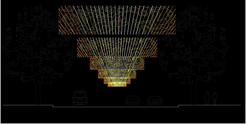 该设计是一场关于几何与透视的游戏。天空呈现出温暖橙色调的日出。尽管这25幅图像完全相同并被反复使用,但整体在透视中如同一幅长达1000米的单一画作。为了实现这一效果,图像中线条的灭点必须在特定高度进行设计与安装,使其与现实相吻合,从而营造出连续绘图的幻觉。而尽管照明是静态的,这件装置却会根据街道上观者的位置与视角发展出自身的动态性,并产生截然不同的变化。