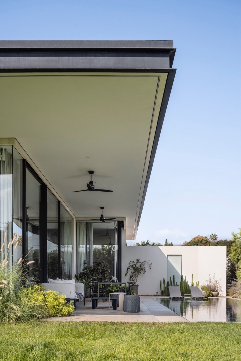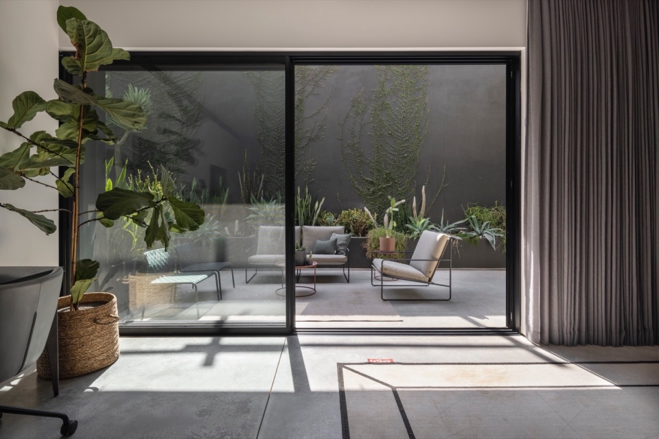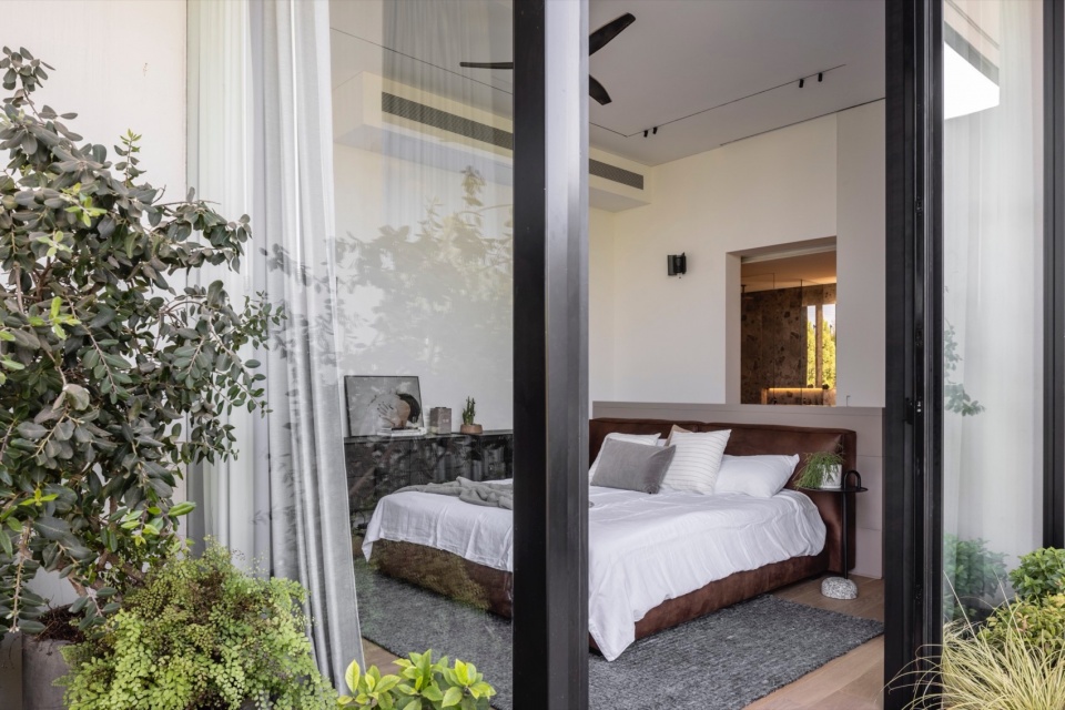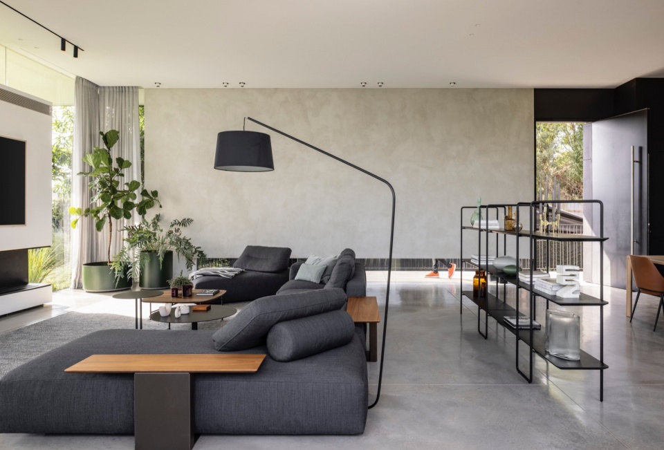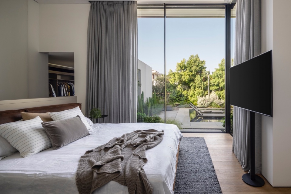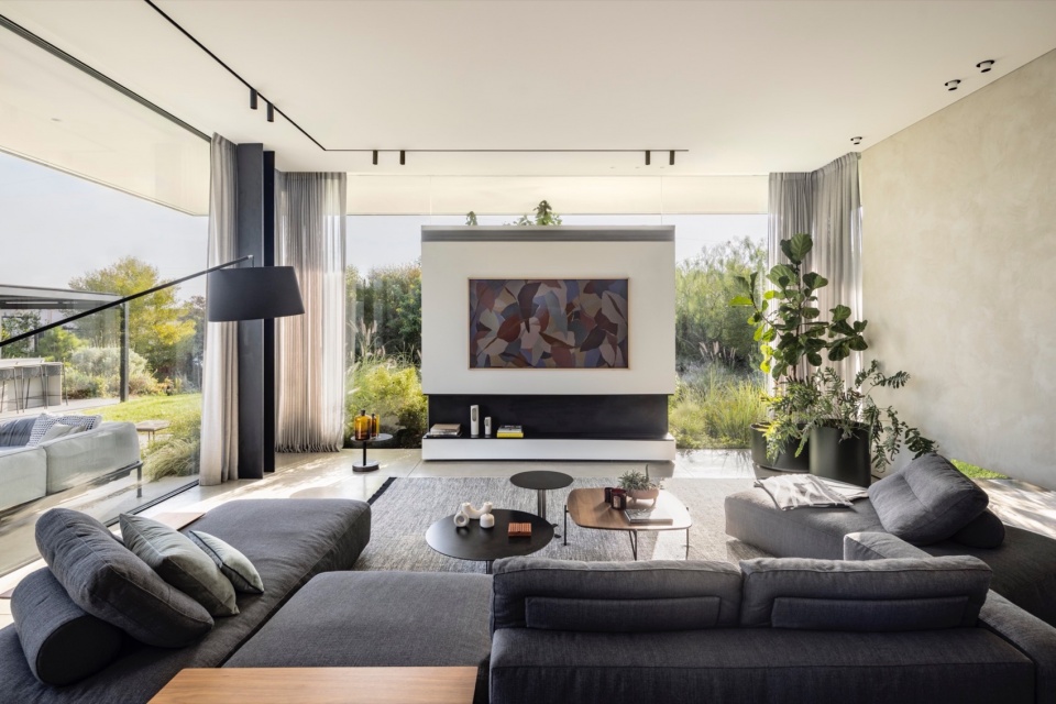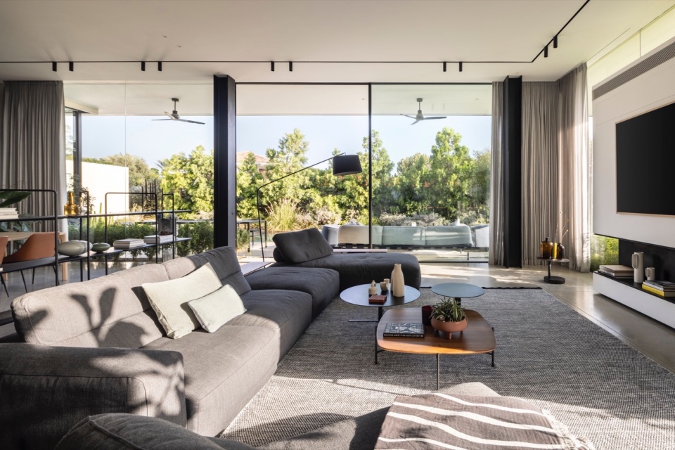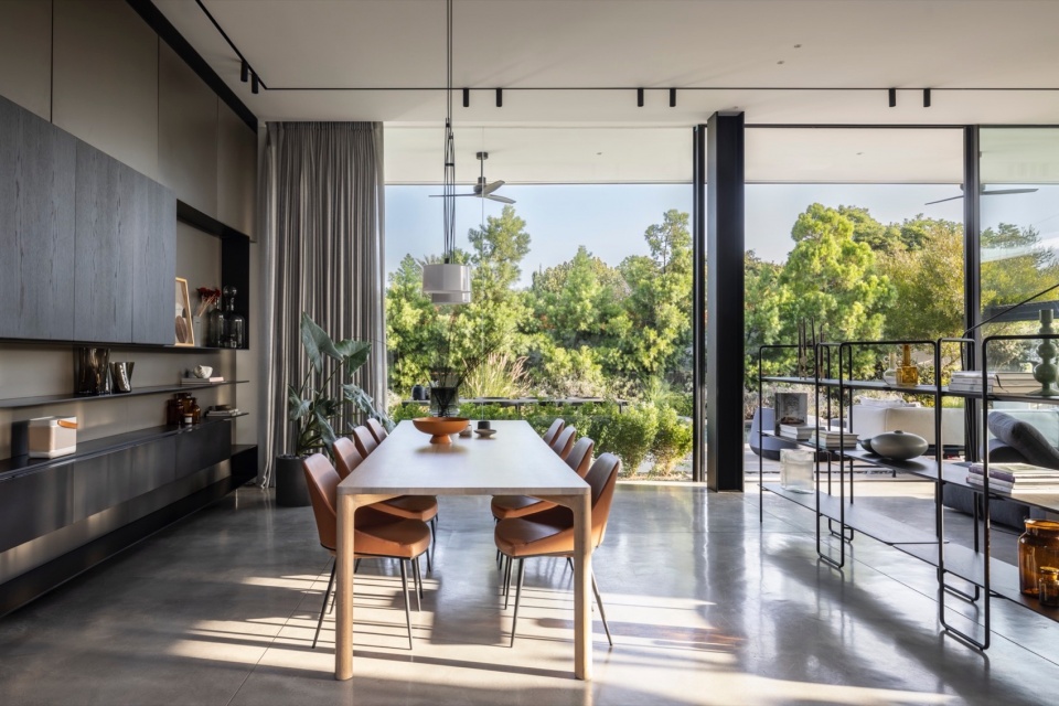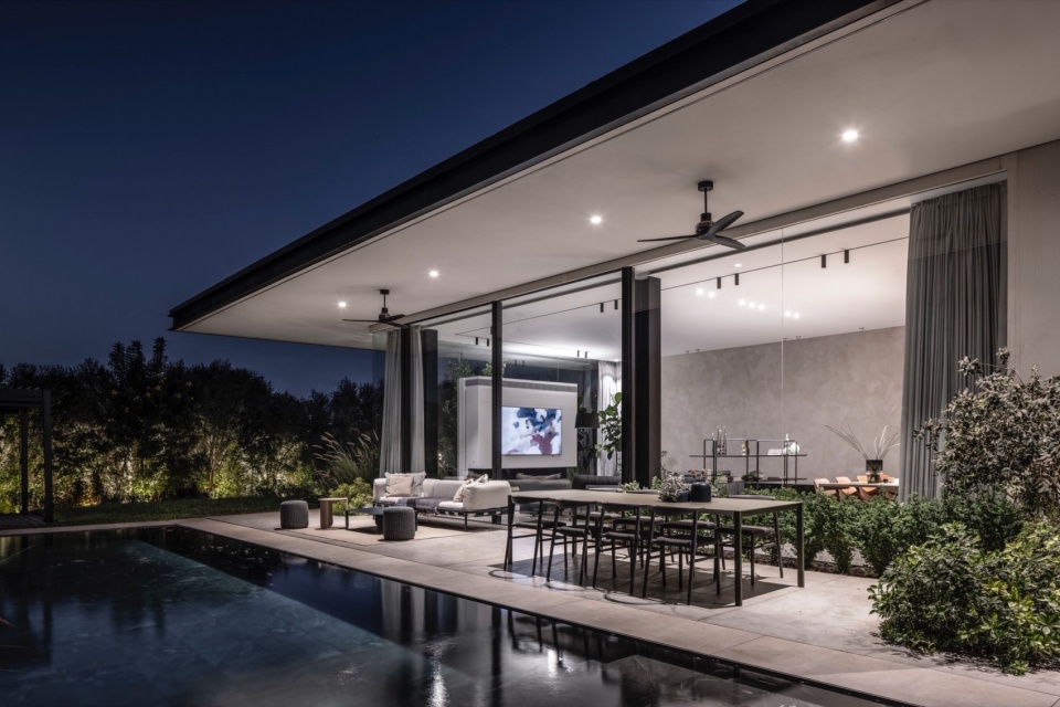主要挑战在于如何在地块内合理布置住宅,以优化日照、景观与隐私,同时满足场地的技术与法规要求。Melamed 的设计哲学贯穿于他的作品体系之中,围绕着绝对的开放性展开——创造从地面到天花的连续开口,消弭室内与室外的界限。在本项目中,这一理念同时具有美学与环境属性。为避免大面积玻璃立面产生温室效应,建筑师将泳池置于北侧,从而确保室内外休憩空间在整日保持舒适阴凉。大面积的玻璃得以实现,源于隐藏式钢柱结构的应用,使窗帘轨道得以嵌入,同时保持视觉的连续与纯净。