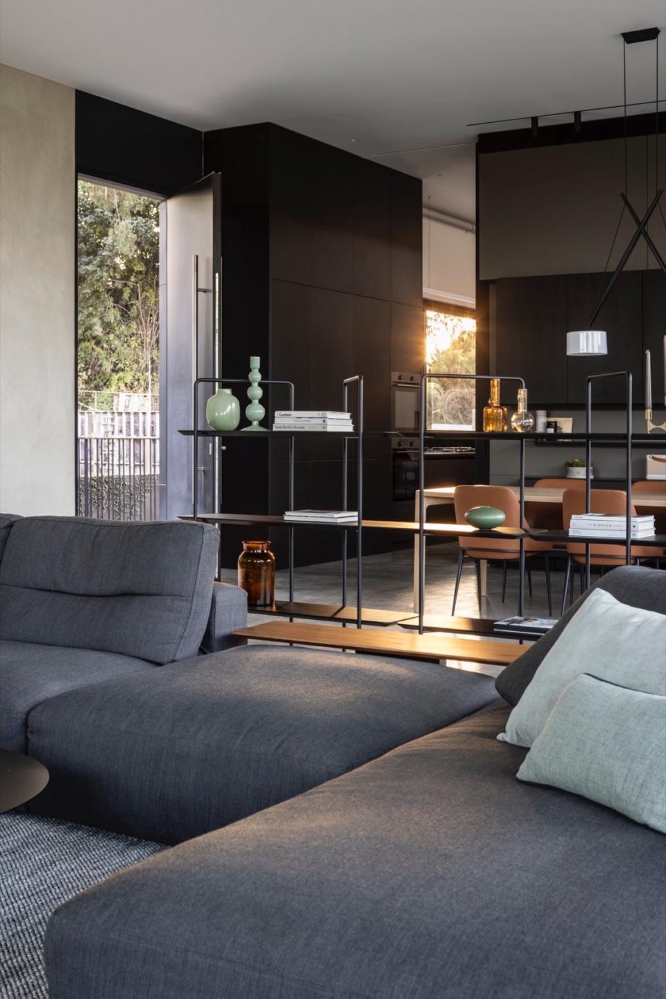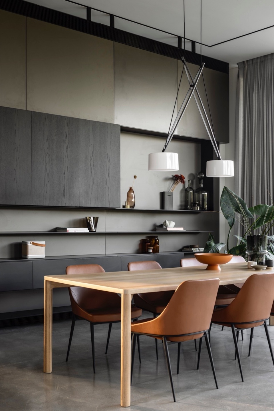 前门开启后,是通向餐区的抛光混凝土地面。餐桌之上,一件雕塑般的灯具悬低浮动,实木餐桌周围环绕着线条纤细、柔软包覆的座椅。其后,一面漂浮的木作墙结合了开放展示与封闭储物——在极简的构图中取得温度与克制的平衡。