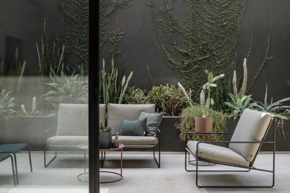 一座钢制楼梯通向地下层,其实体金属栏板同时作为结构支撑。这里设有孩子们的套房。由于法规允许建造完整的地下层且配有独立庭院,而无需设置上层阳台,因此形成了一个半地下的独特居所,通过大型玻璃开口获得充沛的自然光。庭院中布置了一处舒适的户外休息角落,周围环绕着精细挑选的绿植——攀爬的、垂落的、盛开的,沿着低矮花坛与墙面生长。