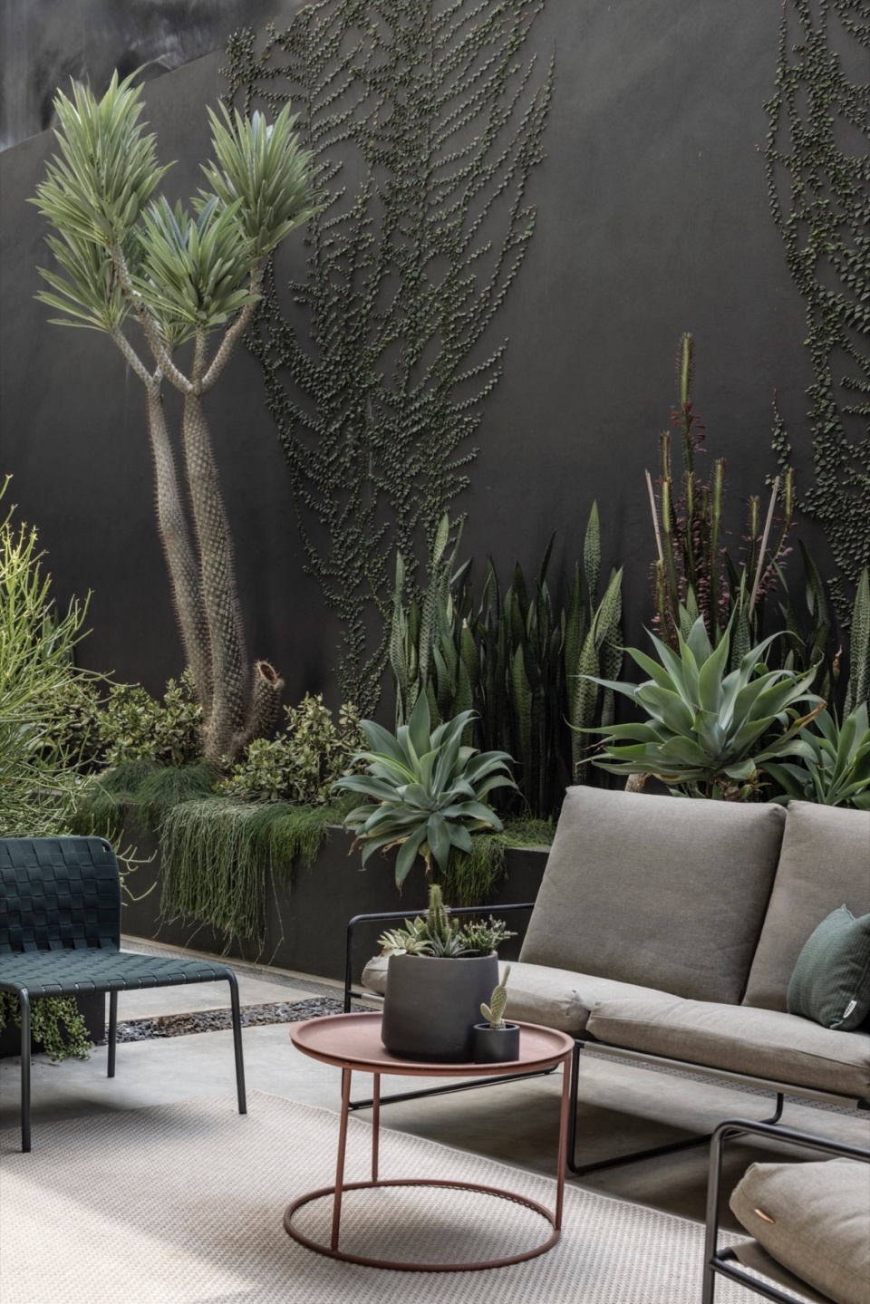 A steel staircase with a solid metal balustrade — doubling as structural support — leads to the basement level, home to the children’s suites. Zoning regulations allowed a full lower level with its own garden rather than upper balconies, creating a unique semi-subterranean retreat flooded with natural light from large glass openings. The courtyard outside hosts a cozy outdoor lounge surrounded by meticulously curated greenery — climbing, cascading, and blooming along low planters and walls.