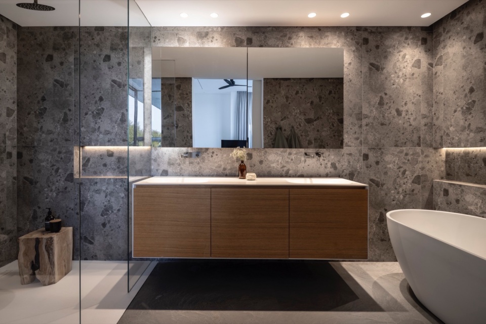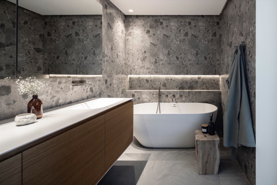 随后的主卫配有独立浴缸和淋浴区,以悬浮木质台盆为中心,背景是带有柔光壁龛的动态水磨石饰面。附近的客卫是一个戏剧化的垂直空间——高达五米,一只圆形独立混凝土洗手盆与发光壁龛立于纹理墙面前,如舞台场景般富有表现力。