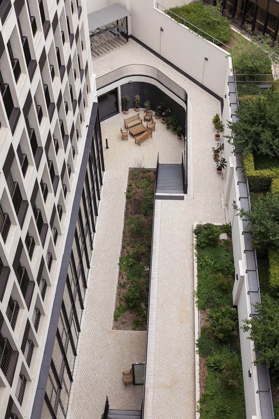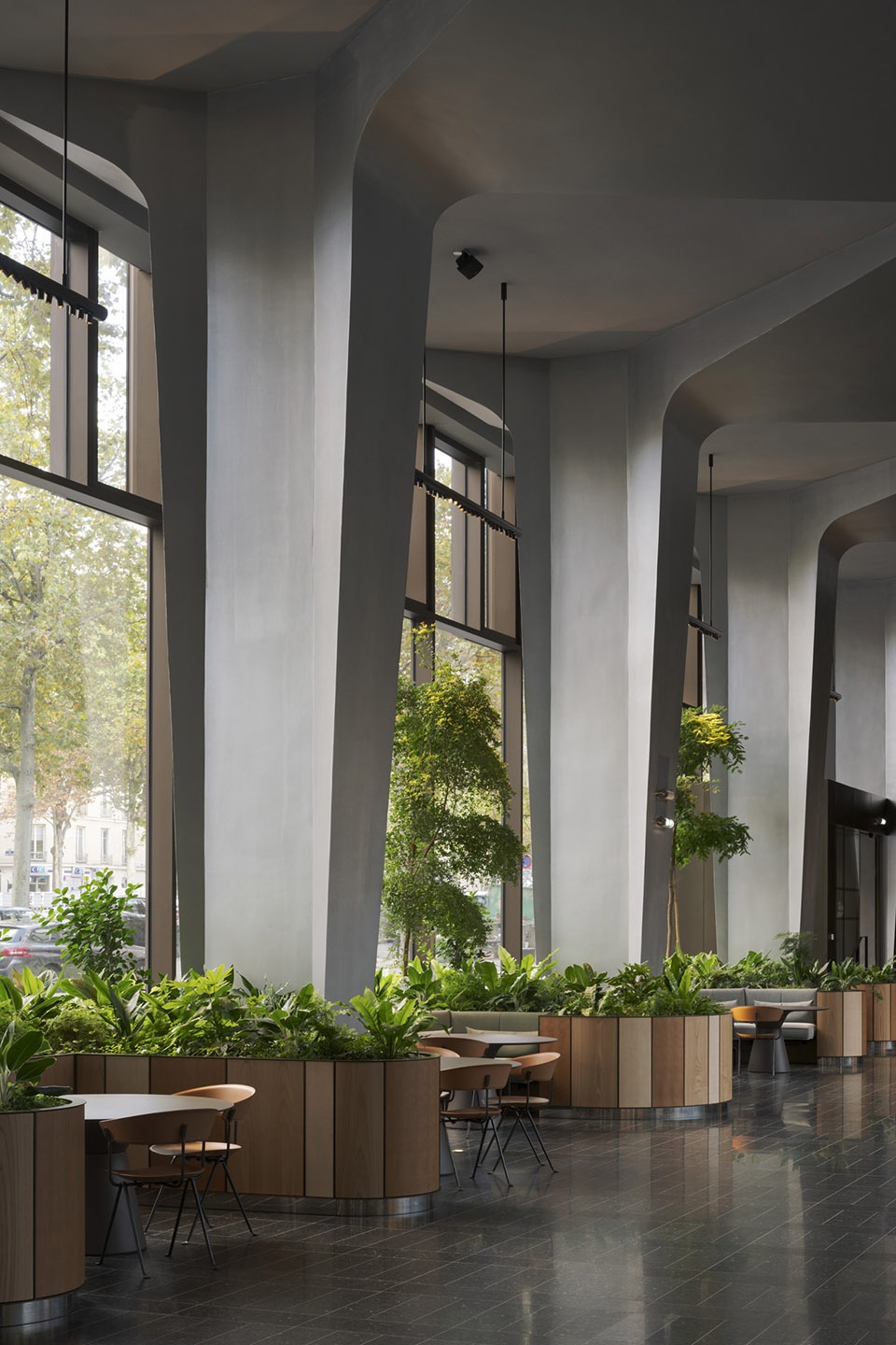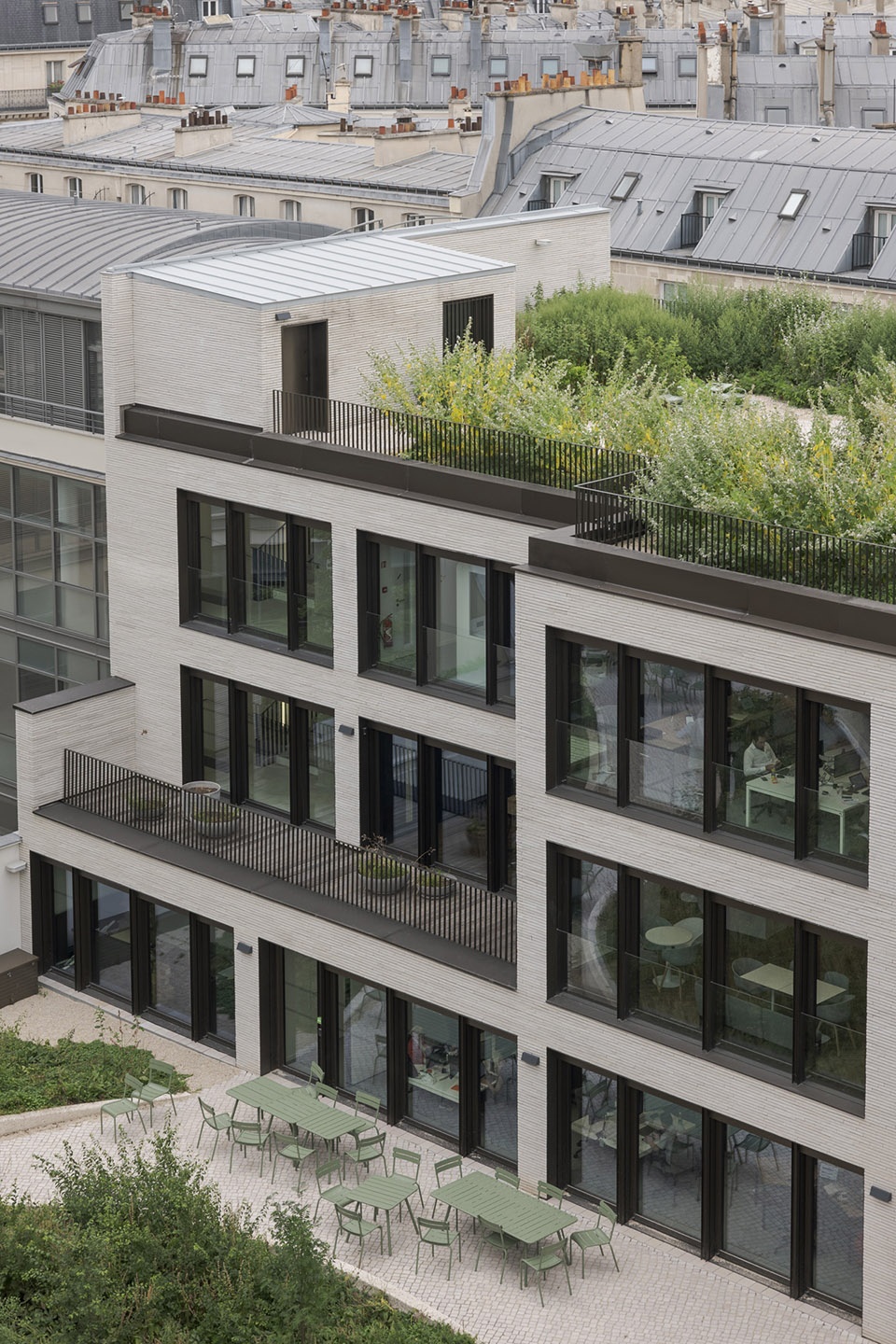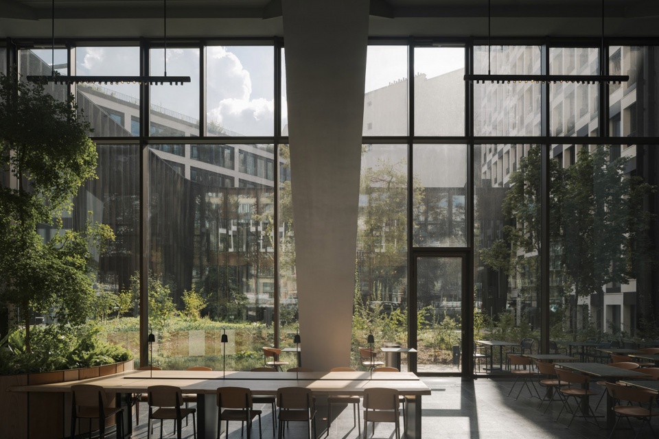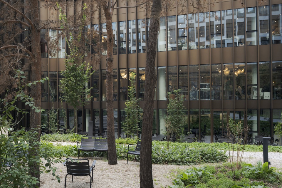 所有现有体积均已保留。内部庭院已被重新设计,以创建公共花园和一个大型覆盖空间;俯瞰Grande Armée大道的画廊已被转换为一个透明的、100米长的大厅;曾经主导屋顶的设备和机械已被替换为景观露台和花园,向建筑用户开放。大自然已回归到工人放松和社交的区域。