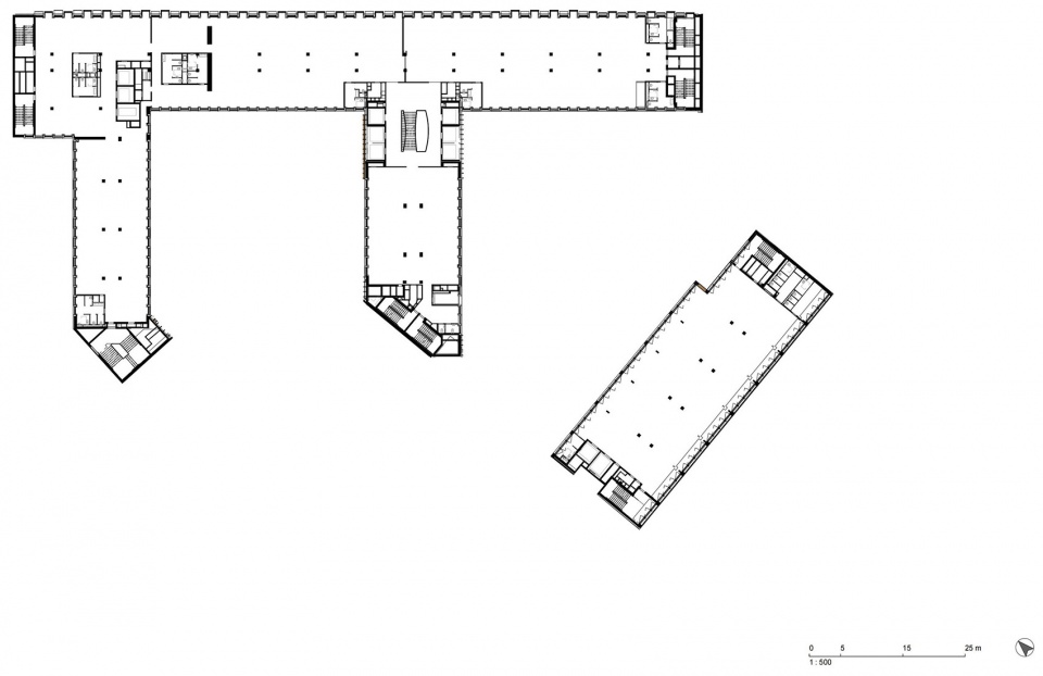 地面层和地下1层的一部分,容纳餐厅、咖啡馆、健身工作室和一个200座的礼堂,向公众开放建筑。回收概念在这里的细节中可见。从原始建筑立面直接取下的花岗岩块已被加工成画廊的地板,其引人注目的混凝土柱和高天花板让人联想到教堂的中殿。各种入口核心已调整以满足当前需求;主入口现在设有全景电梯和开放楼梯。
