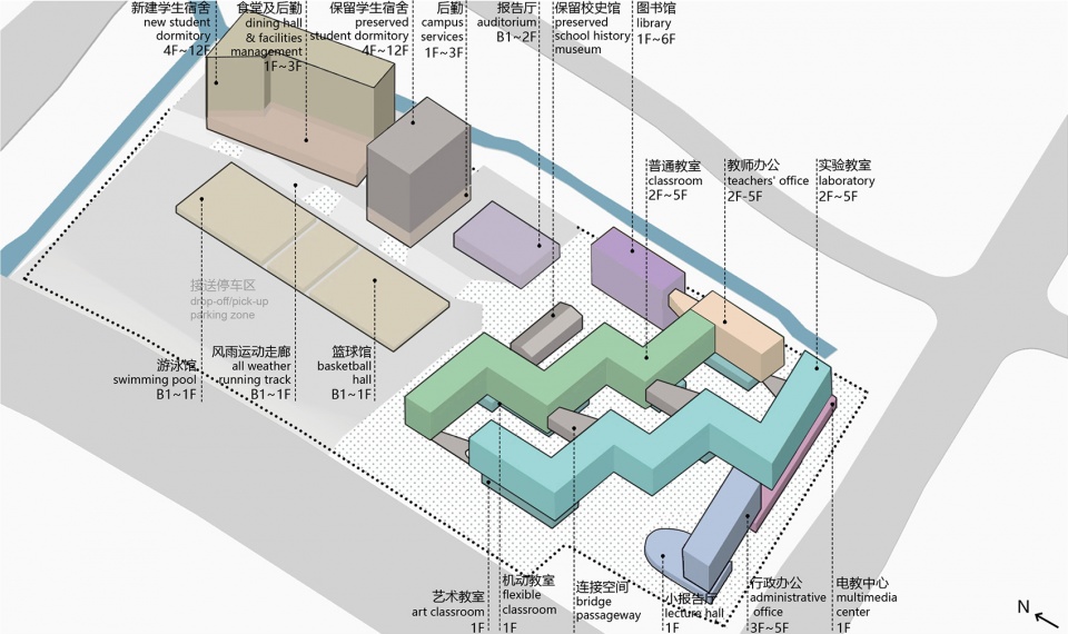 基于此现状,总平面规划以文保建筑及周边保留的大树作为核心景观,其南侧为教学办公区,北侧为生活运动区。北区西侧400米操场架空抬高,下方空间得以高效利用:临路一侧做家长可进入校园接送的停车区,减少对校门口道路的交通压力;中部为半下沉的游泳馆、训练馆、篮球馆以及风雨运动跑道,东侧为礼堂和食堂。架空操场之上,新旧两栋高层宿舍楼并置,与周边的高层住宅共同形成东高西低的城市肌理。师生课间登上操场,可获得在高密度环境中的远眺视野和放松的出口。