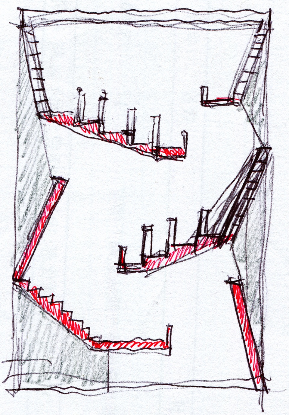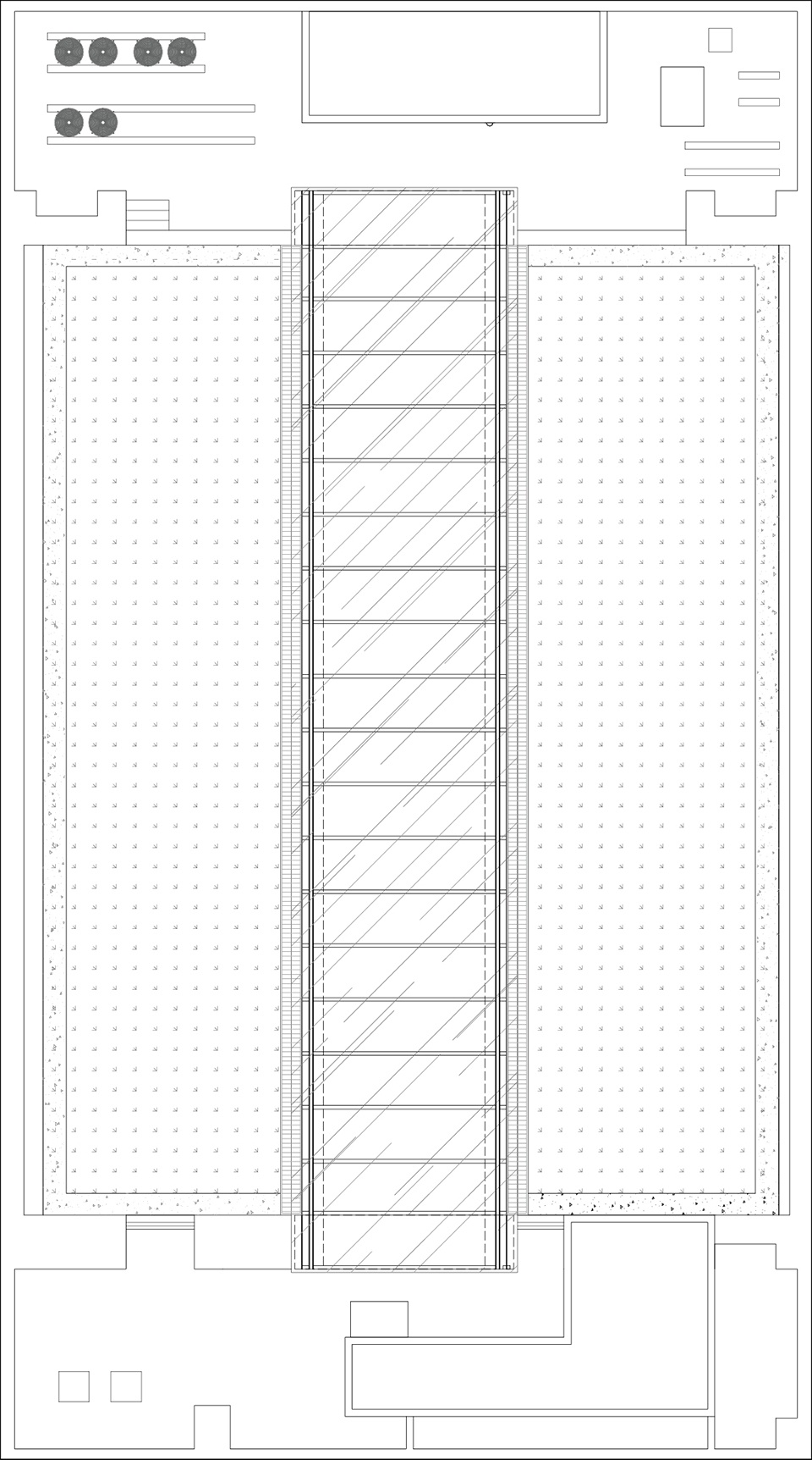 Building service runs from the core walls on both side of the atrium, with pipes and ducts routed through the voids within the long-span structure. An elevated floor system accommodates sprinkler lines and air ducts while preserving the integrity of the exposed concrete surfaces. Air supply outlets are integrated into built-in bookshelves, desks, and railing, achieving a unified design of architecture, structure, services, and finishes.