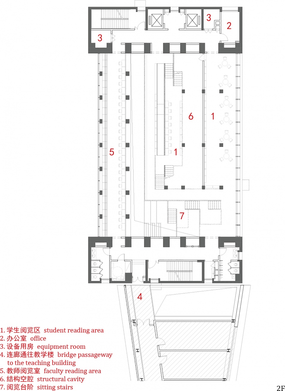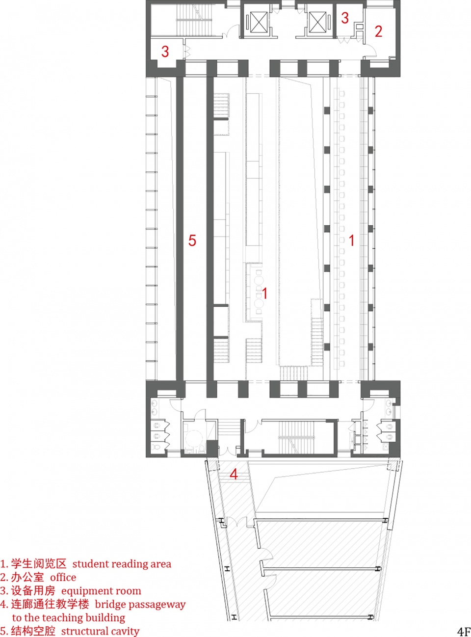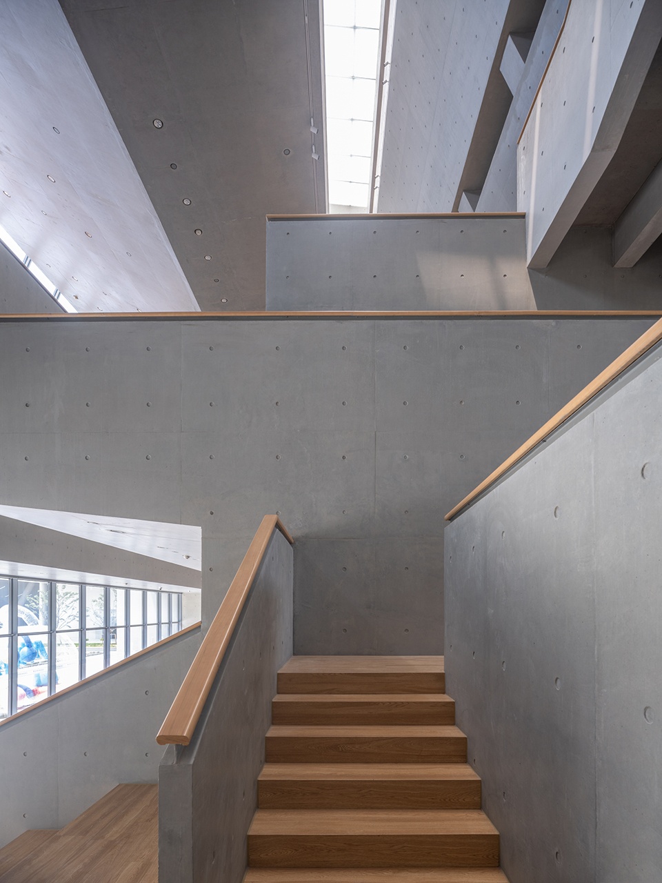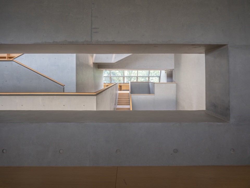 The large-span terraces and tubes, employing inclined box-section and rectangular beams, are supported by the core walls at both ends end of the atrium. Such structural system enables tall, slanted windows that frame views of the surrounding trees, drawing the greenery inward. Continuous strip windows maintain visual connection between the tubular reading rooms and the atrium.