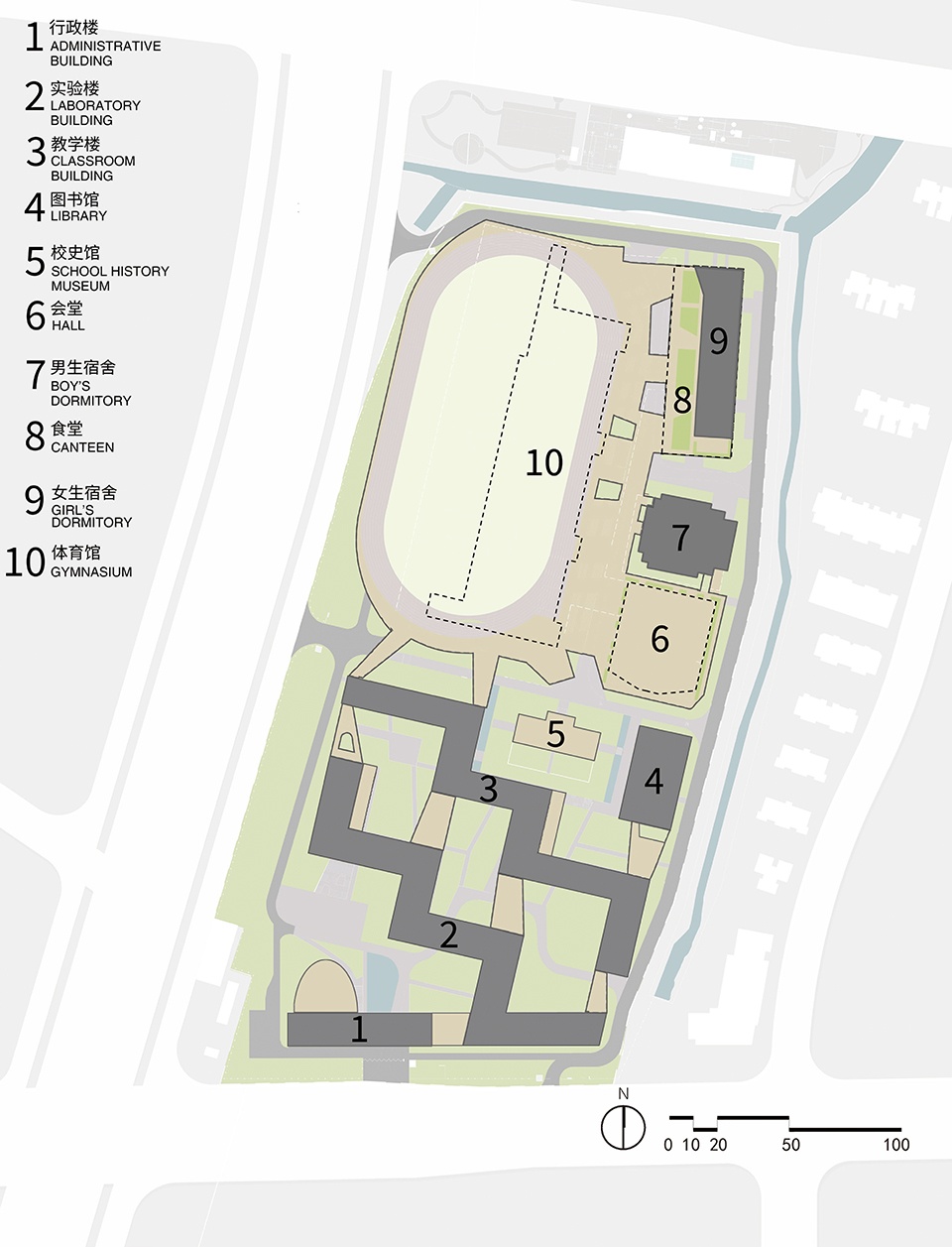 The Xiaozhuang Campus of the High School Affiliated to Nanjing Normal University (NSFZ) occupies a 66,700 sq.m site, with a total building area of approximately 95,000 sq.m. A further 17,000 sq.m of semi-outdoor space is not counted toward the floor area ratio. The campus is designed to accommodate 42 classes, forming a high-density, compact campus due to the limited land availability. At the center of the site, a heritage structure—the former Second Communication Station of the Republic of China Air Force is preserved, along with a high-rise dormitory built in recent years that awaits renovation.