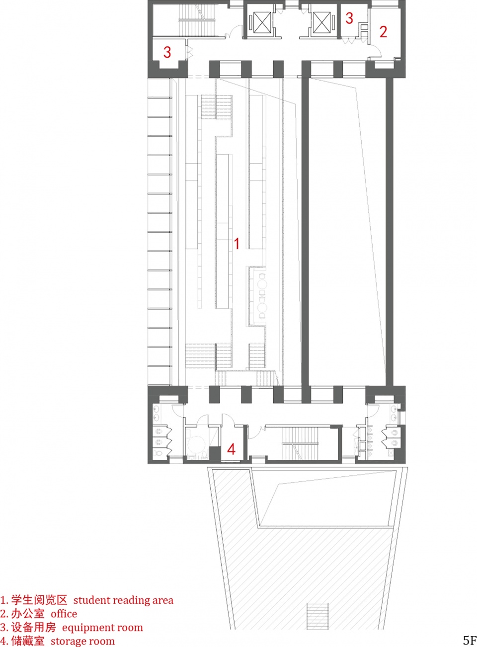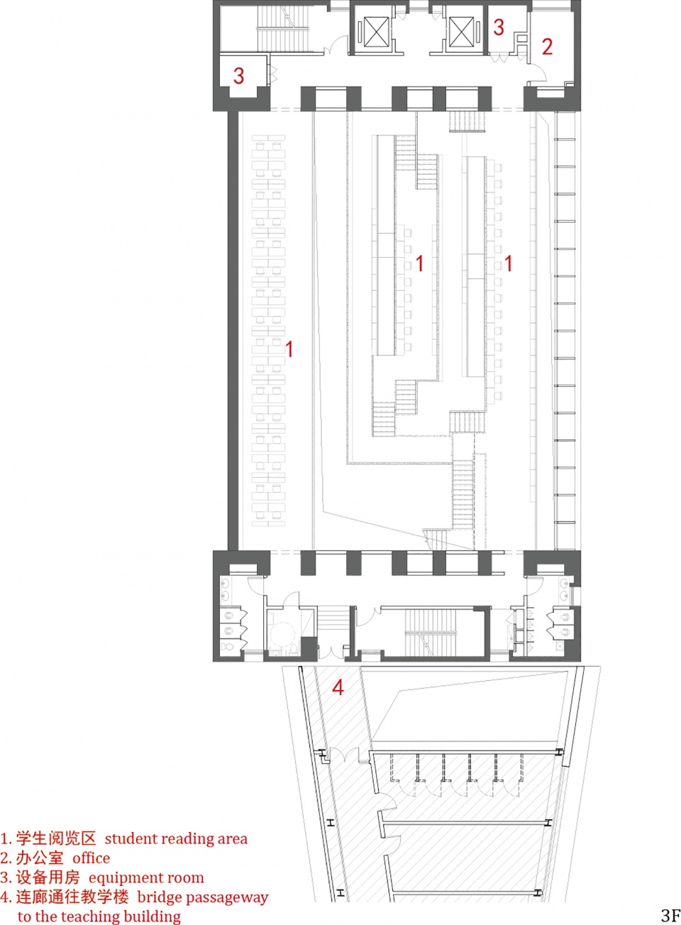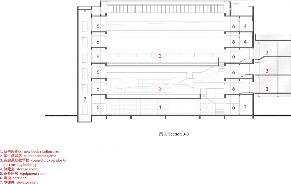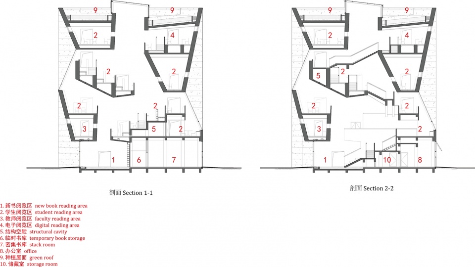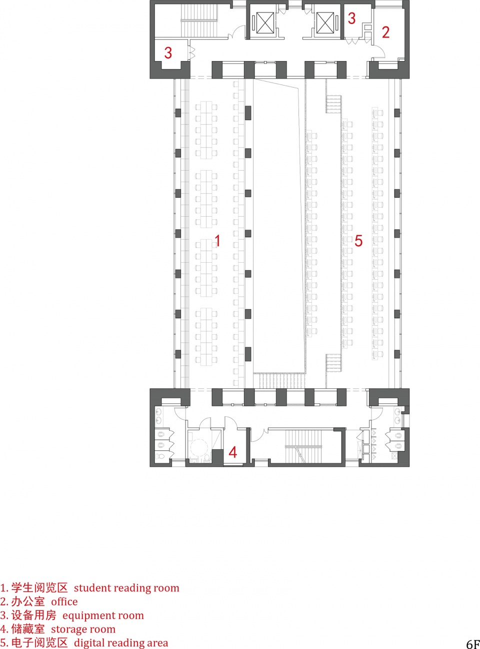 The design departs from conventional floor plates, interweaving five large-span, tubular or terraced reading volumes within a shared atrium. These built forms generate two distinct reading environments: semi-enclosed spaces and open terraces. A central skylight introduces natural light into the atrium, which is then diffused through multiple reflections to create a layered, luminous atmosphere. A continuous “wandering path” connects the terraced reading areas. Beginning at the ground-floor lobby, it links the new book area, service desk, reading bleachers, and multi-level student reading platforms, ultimately extending to the top-floor digital reading room. Gently sloped ramps ensure accessible circulation between all platforms. The semi-enclosed tubular reading spaces primarily house faculty reading rooms and book stacks. The semi-enclosed tubular spaces align with the main floor levels in elevation.